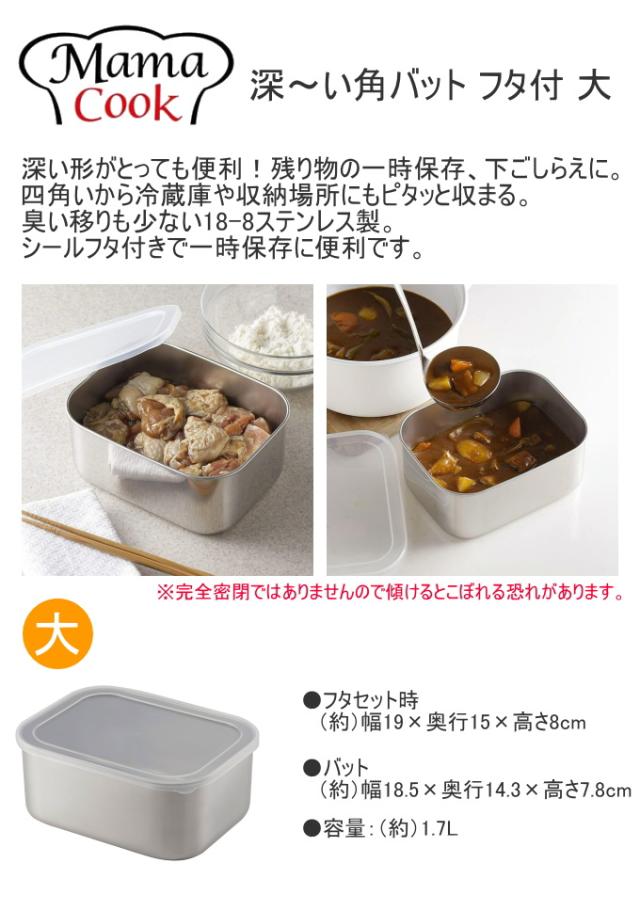 ママクック 深〜い角バット フタ付 大 1個 43253 日本製 燕三条 18-8ステンレス ステンレス製 角バット バット 角型 四角 フタ付き 深型 保存 下準備 下ごしらえ 汁物 キムチ 漬物 薬味 ニオイ移りしにくい 丈夫 便利 キッチン キッチン用品 調理 保存容器 下村企販