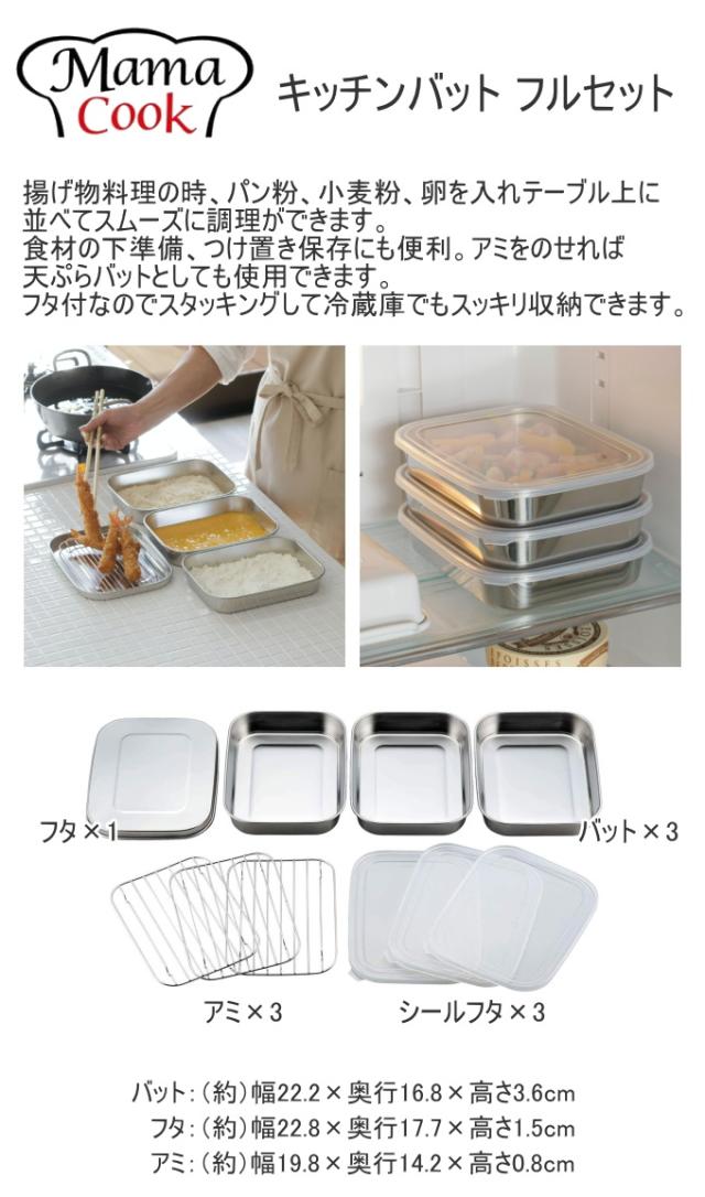 ママクック キッチンバット フルセット 31552 日本製 燕三条 18-8ステンレス ステンレス製 バット アミ フタ キッチンバット 10点セット 揚げ物 とんかつ フライ 天ぷら から揚げ 油切り ヘルシー 下準備 つけ置き保存 丈夫 便利 キッチン用品 調理器具 下村企販