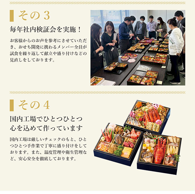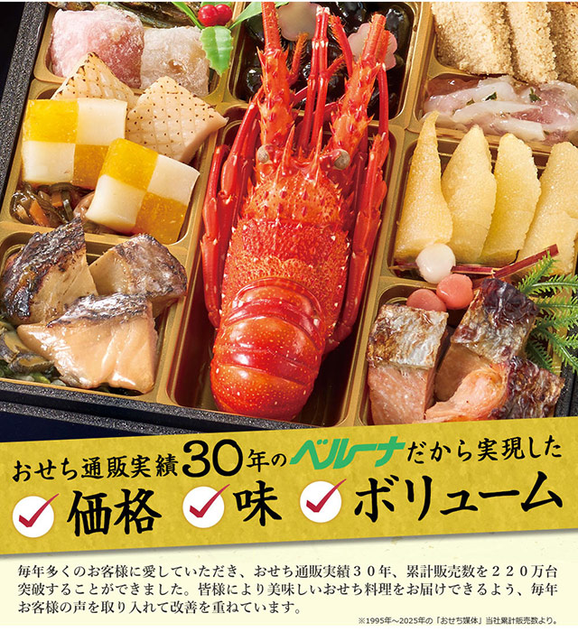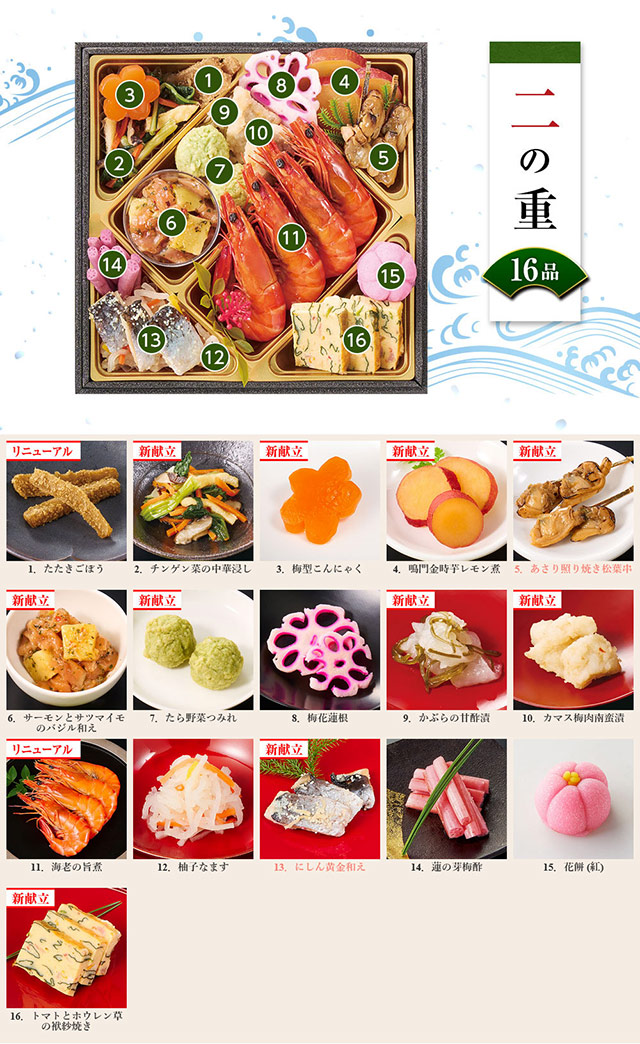 ◆田作り煮 ◆くるみ入り餅(紅)◆くるみ入り餅(白)◆黒豆煮 ◆梅型百合根羊羹 ◆いかのジュレ和え ◆真鱈子新丈 ◆いか刺し昆布 ◆いか白焼 ◆金柑百合根市松 ◆ロブスター ◆松前漬 ◆数の子 ◆アカニシ貝と菜の花の昆布和え ◆真鯛幽庵焼 ◆紅白餅玉串 ◆鮭柚庵焼