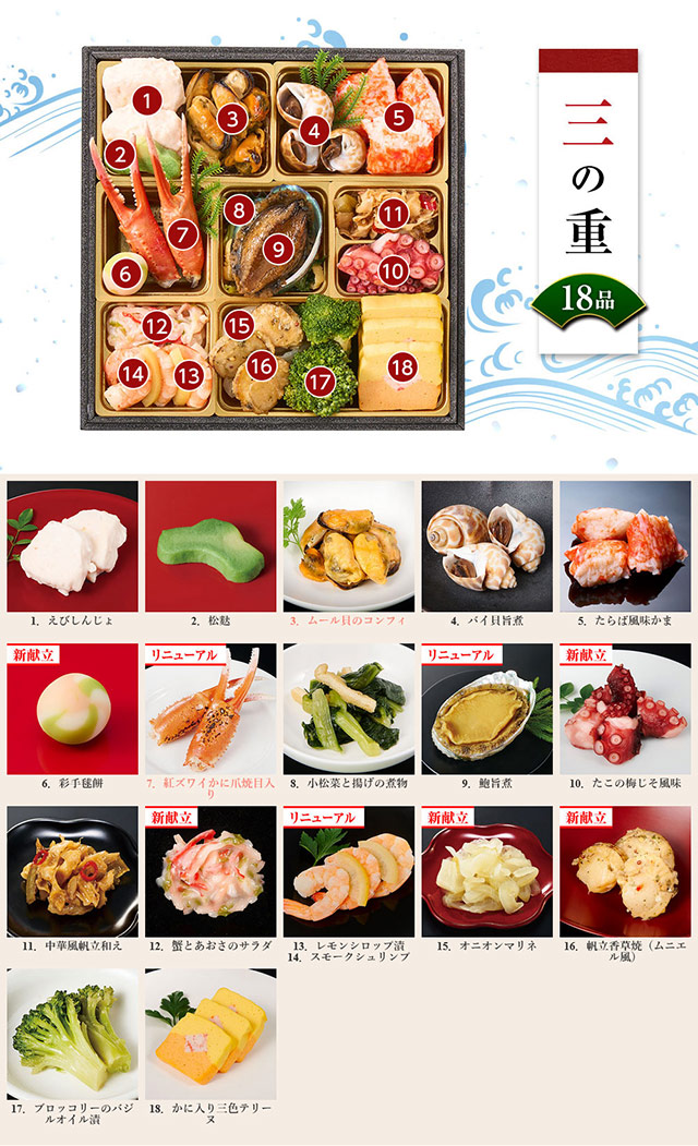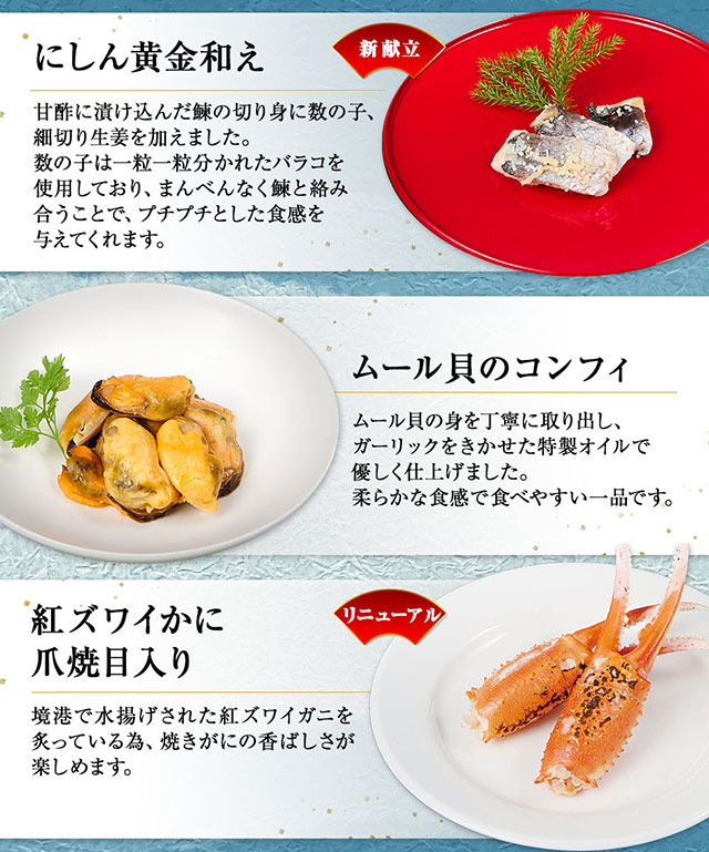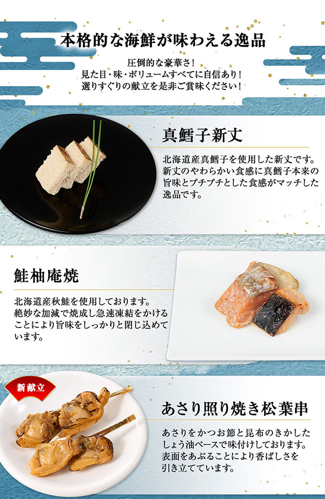 ◆えびしんじょ ◆松麩 ◆ムール貝のコンフィ ◆バイ貝旨煮 ◆たらば風味かま ◆彩手毬餅 ◆紅ズワイかに爪焼目入り ◆小松菜と揚げの煮物 ◆鮑旨煮 ◆たこの梅じそ風味 ◆中華風帆立和え ◆蟹とあおさのサラダ ◆レモンシロップ漬 ◆スモークシュリンプ ◆オニオンマリネ ◆帆立香草焼(ムニエル風) ◆ブロッコリーのバジルオイル漬 ◆かに入り三色テリーヌ