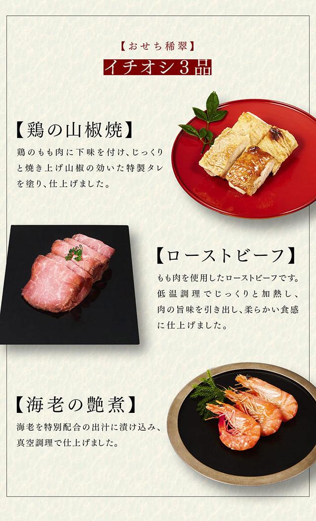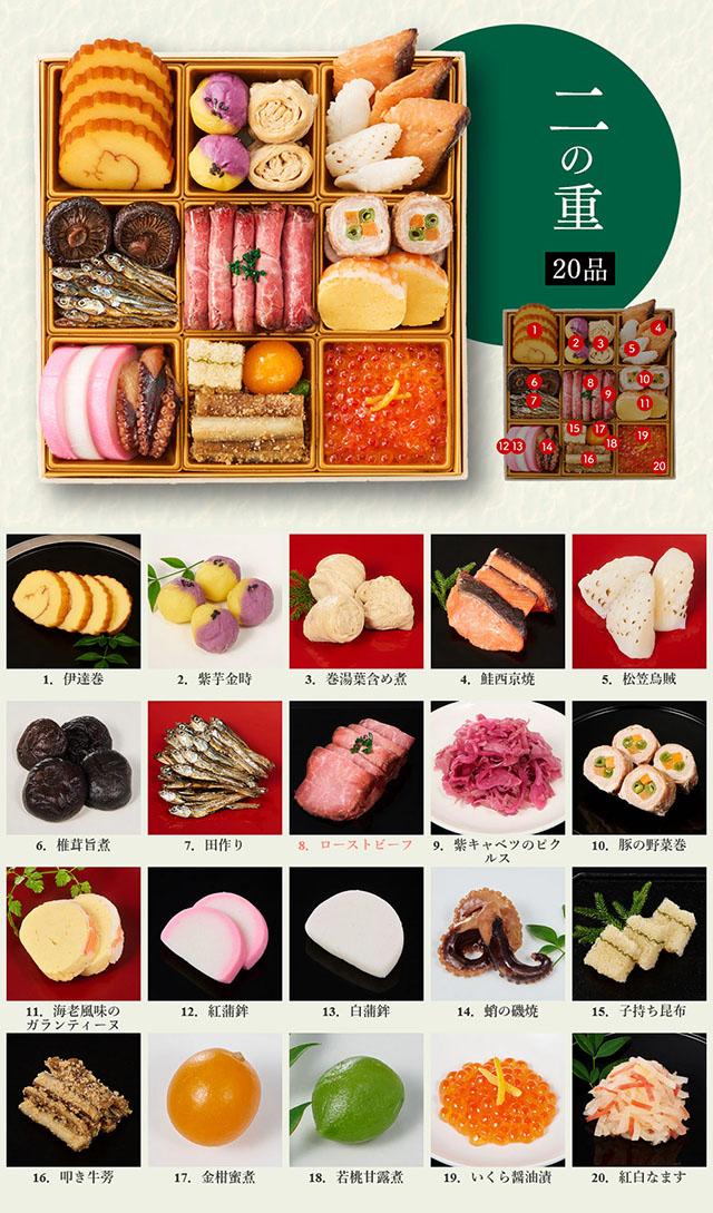 ◆伊達巻◆紫芋金時◆巻湯葉含め煮◆鮭西京焼◆松笠烏賊◆椎茸旨煮◆田作り◆ローストビーフ◆紫キャベツのピクルス◆豚の野菜巻◆海老風味のガランティーヌ◆紅蒲鉾◆白蒲鉾◆蛸の磯焼◆子持ち昆布◆叩き牛蒡◆金柑蜜煮◆若桃甘露煮◆いくら醤油漬◆紅白なます