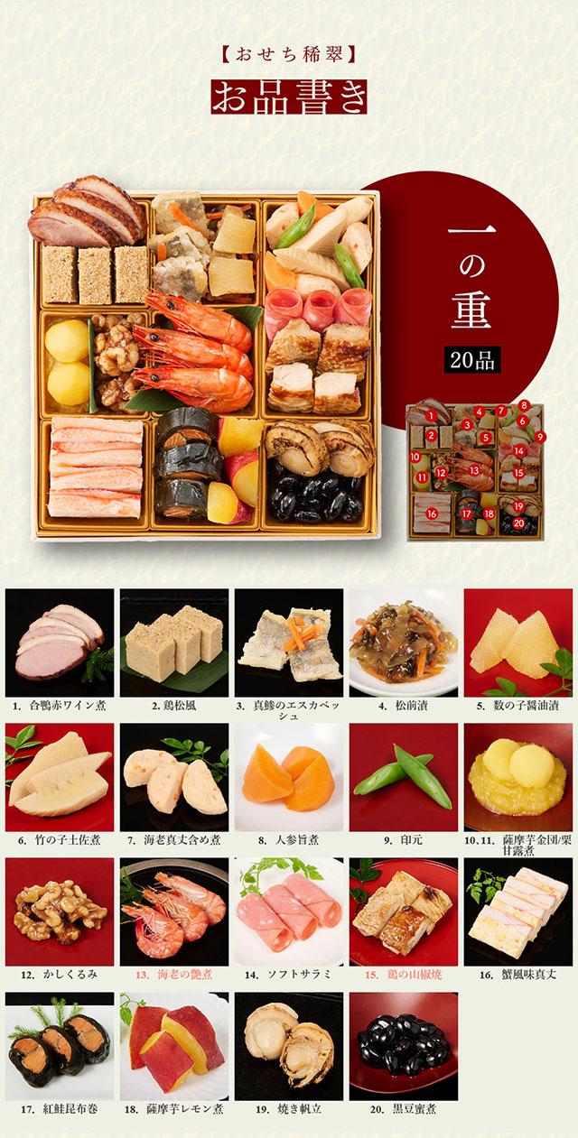 ◆合鴨赤ワイン煮◆鶏松風◆真鯵のエスカベッシュ◆松前漬◆数の子醤油漬◆竹の子土佐煮◆海老真丈含め煮◆人参旨煮◆印元◆薩摩芋金団◆栗甘露煮◆かしくるみ◆海老の艶煮◆ソフトサラミ◆鶏の山椒焼◆蟹風味真丈◆紅鮭昆布巻◆薩摩芋レモン煮◆焼き帆立◆黒豆蜜煮