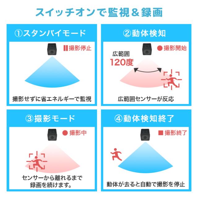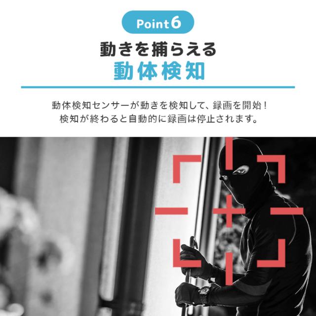 「動体検知センサー」付き!動きを検知して録画を開始!検知が終わると自動で録画停止。