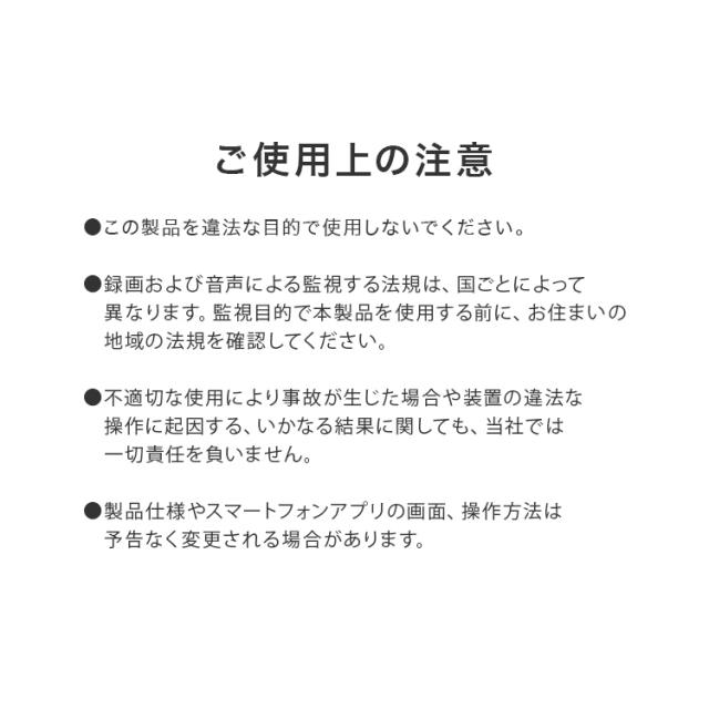 | 注意事項 | ・録画および音声による監視する法規は、国ごとによって異なります。監視目的で本製品を使用する前に地域の法規を確認してください。