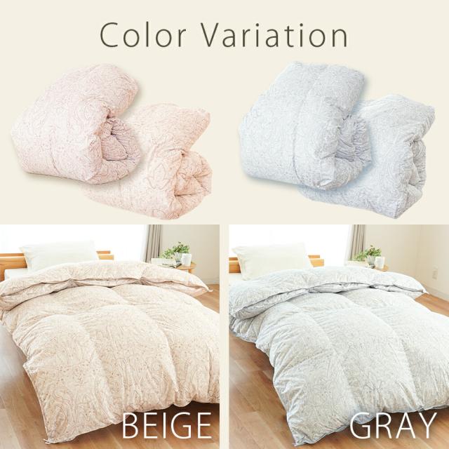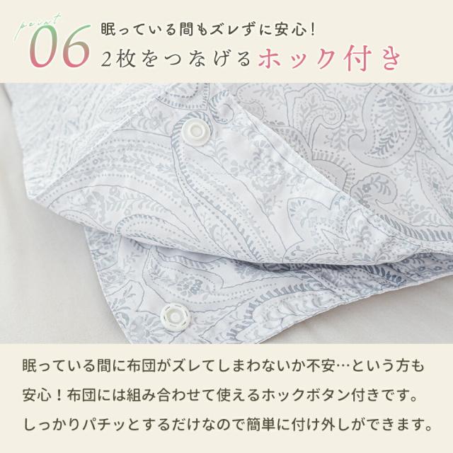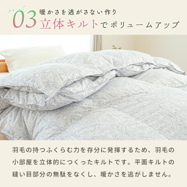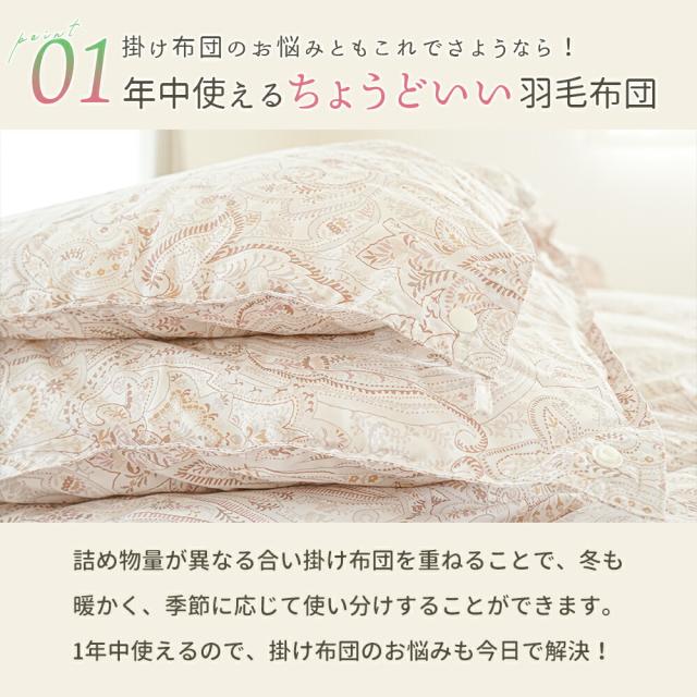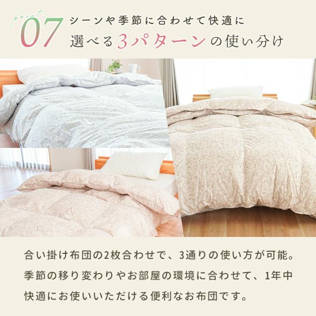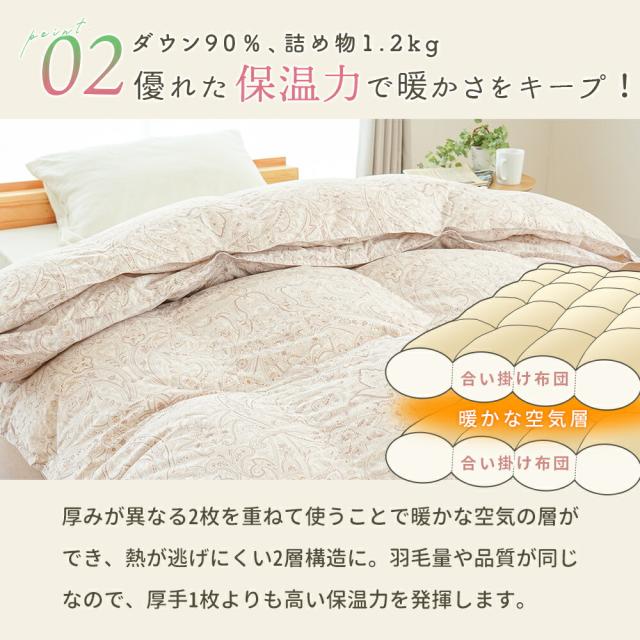 | ・掛け布団のお悩みともこれでさようなら!年中使えるちょうどいい羽毛布団 詰め物量が異なる合い掛け布団を重ねることで、冬も暖かく、季節に応じて使い分けすることができます。1年中快適に使える便利な布団で、掛け布団のお悩みも今日で解決! ・ダウン90%で詰め物量1.2kg。優れた保温力で暖かさをキープ厚みが異なる2枚を重ねて使うことで暖かな空気の層ができ、熱が逃げにくい2層構造に。羽毛量や品質が同じなので、厚手1枚よりも高い保温力で発揮します。 ・暖かさを逃がさない作り。立体キルトでボリュームアップ羽毛の持つふくらむ力を存分に発揮するため、羽毛の小部屋を立体的につくったキルトです。平面キルトの縫い目部分の無駄をなくし、暖かさを逃がしません。 ・環境に配慮した再生繊維生地。軽やか&柔らかさをプラス軽くて柔らかな再生繊維(リヨセル)に、丈夫なポリエステルを配合し、さらなる耐久性をプラスしました。優れた吸湿性と通気性を兼ね備えました。 ・安心安全の高品質な国内品、老舗メーカー・西川製品品汁にこだわりたい方も安心。日本有数の寝具メーカー「西川」の製品です。長い歴史の中で、積み重ねられたその技術は、高い品質と信頼があります。 ・眠っている間もズレずに安心!2枚をつなげるホック付き眠っている間に布団がズレてしまわないか不安…という方も安心!布団には組み合わせて使えるホックボタン付きです。しっかりパチッとするだけなので簡単に付け外しができます。 ・シーンや季節に合わせて快適に、選べる3パターンの使い分け合い掛け布団の2枚合わせで、3通りの使い方が可能。季節の移り変わりやお部屋の環境に合わせて、1年中快適にお使いいただける便利なお布団です。 | |