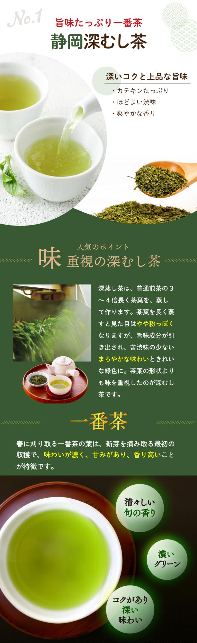 一番茶とはその年の最初に摘み取られた新芽で作った甘み渋み旨みなど濃厚な味を感じられるお茶です。 一番茶入りだから!お茶らしい渋味の中にほんのり甘味を感じるまろやかな静岡産深蒸し茶に仕上がりました。