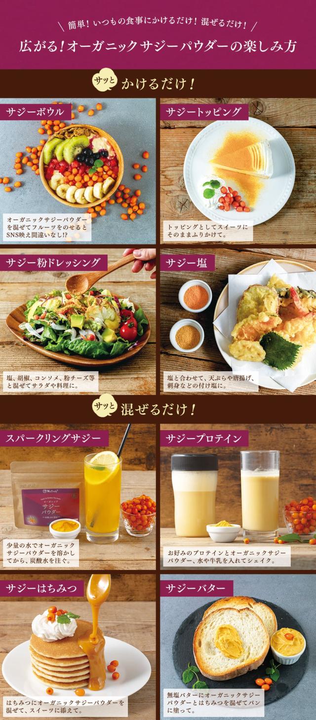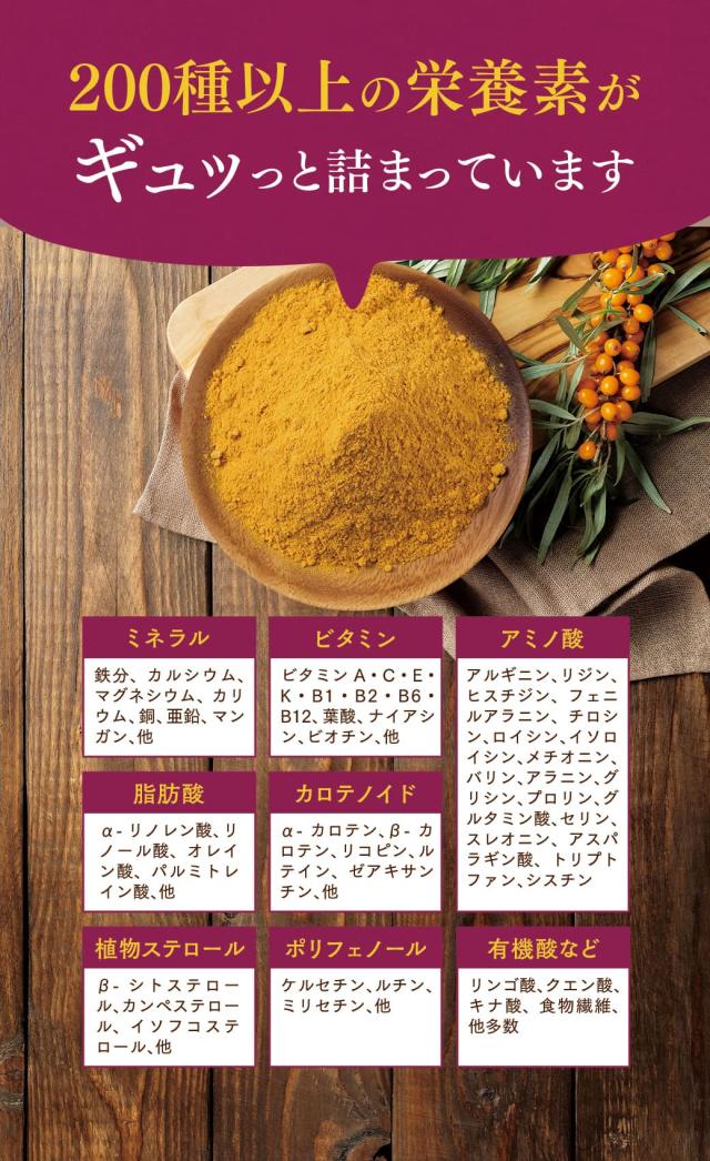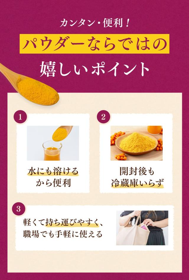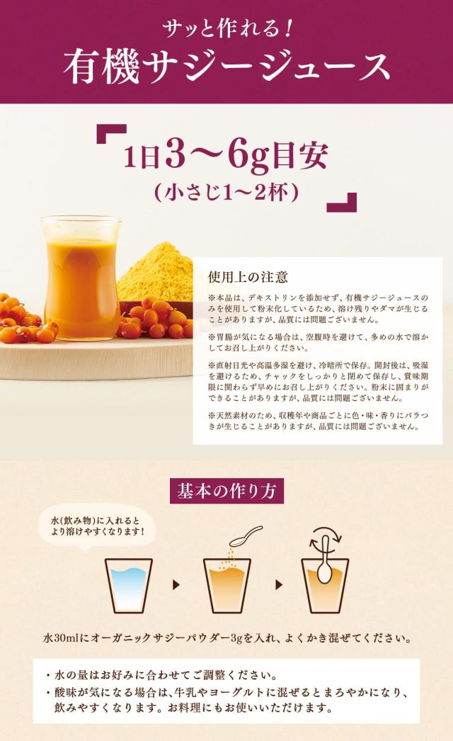 | 使用方法 | ●1日当たり3〜6gを目安に、水などのお飲みものやヨーグルト、料理に混ぜてお召し上がりください。 【サジージュースの作り方】 水30mlに3gを入れ、よくかき混ぜてください。(水の分量はお好みで調整) ※有機サジーのみを使用して粉末化しているため、溶け残りやダマが生じたり、粉末が固まる場合があります。 ※天然由来のため、収穫時期や商品ごとに色、味、香りにバラつきが生じることがございますが、品質には問題ございません。 |