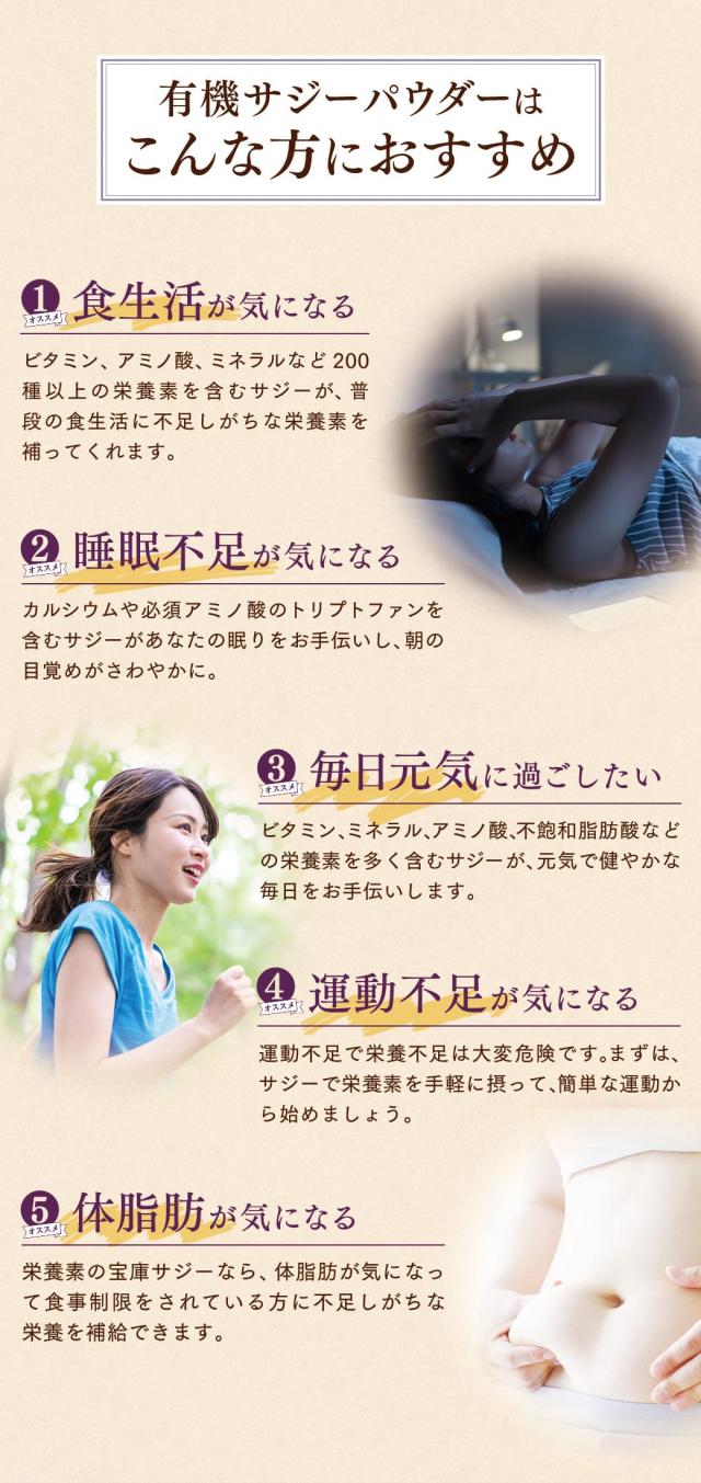 - お試しに10本入りのパウダーサジーを飲んで見ましたけど、段々身体の調子が良くなって来ましたので続けて飲みたいと思いリピートして購入しました♪これでお出かけができるようになると思います(^_^)ノ