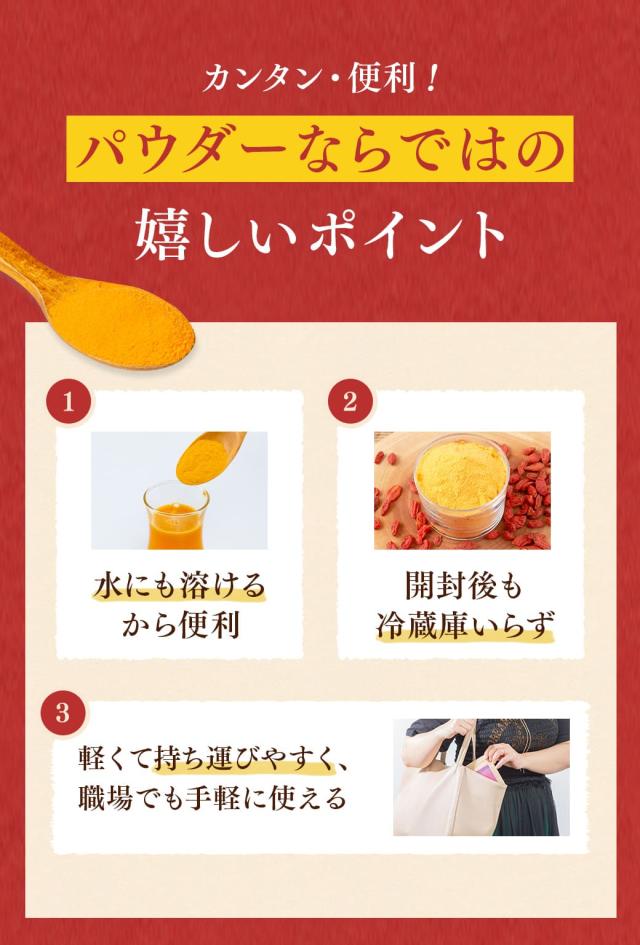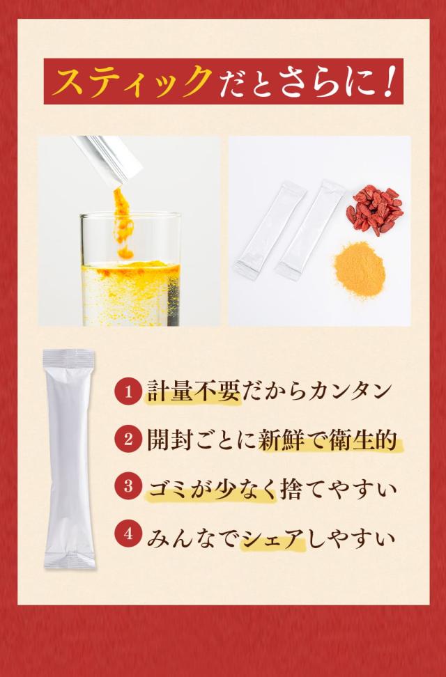 | 使用方法 | ●1日当たり3〜6g(1〜2本)を目安に、水などのお飲みものやヨーグルト、料理に混ぜてお召し上がりください。 【クコの実ジュースの作り方】 水30mlに1本3gを入れ、よくかき混ぜてください。(水の分量はお好みで調整) ※有機クコの実のみを使用して粉末化しているため、溶け残りやダマが生じたり、粉末が固まる場合があります。 ※天然由来のため、収穫時期や商品ごとに色、味、香りにバラつきが生じることがございますが、品質には問題ございません。 |