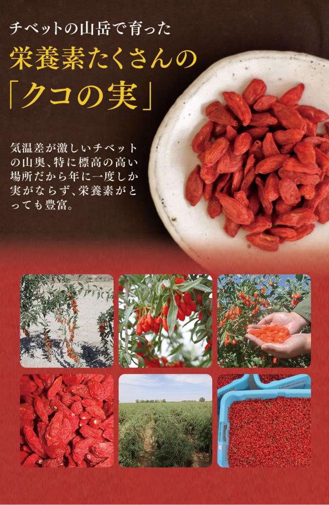 ■クコの実の魅力■・ビタミン/必須アミノ酸/ミネラル/カリウム/鉄分を豊富に含んだ栄養バランスの優れたクコの実はチアシードやアサイーなどと同じくスーパーフードとして注目されており、海外でも枸杞子(クコシ)/ゴジベリー/ウルフベリーなどと呼ばれ、美容や健康に関心の高い女性に広く好まれています。・クコにはゼアキサンチンも豊富に含まれており、年齢を重ねるごとに気になるブライトダメージから目をを守り、健やかで美しい瞳を保つことにも効果があると期待されています。