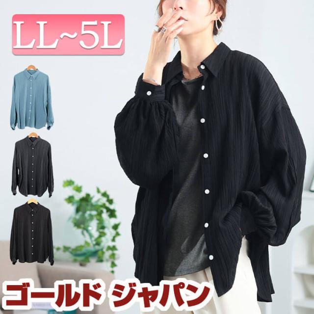 冬新作 大きいサイズ レディース トップス シャツ ブラウス 楊柳風ジャガードボリュームスリーブシャツ 長袖 ボリュームスリーブ ボリューム袖 楊柳 ラウンドカット ストレッチ ゆったり 夏服 秋服 春服 LL 2L 3L 4L 5L ブラック 黒 ブルー チャコール ゴールドジャパン