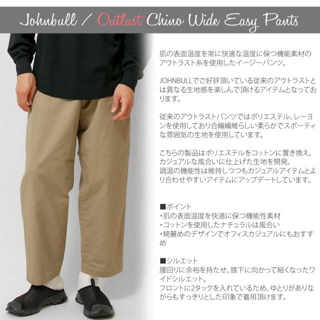【NASA開発機能素材】ジョンブル メンズ Johnbull アウトラスト チノワイド イージーパンツ ( JM231P18 ) スポーティ OUTLAST ストレッチ ウエストゴム ボトムス クロップドパンツ ロングパンツ モード ワイドテーパードパンツ オフィス John bull