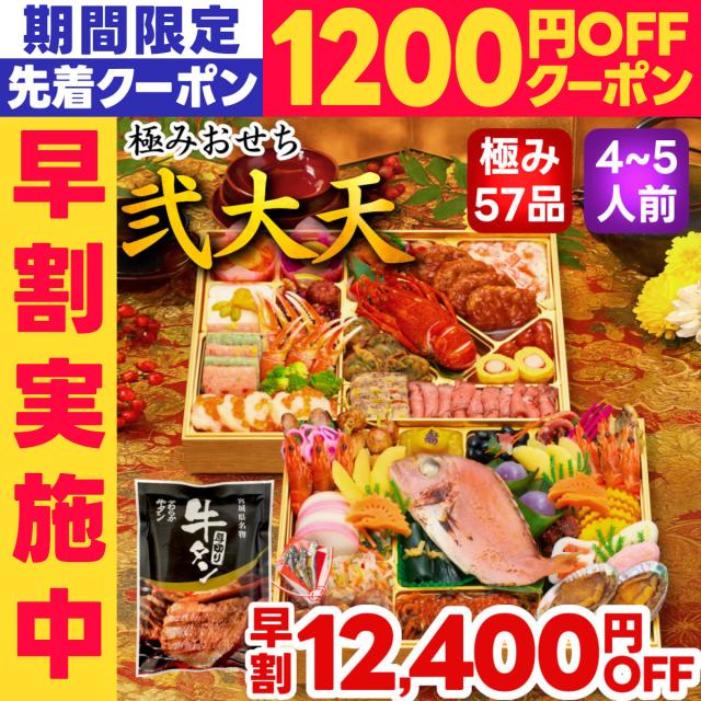 \1200円クーポン/ おせち おせち料理 2026 予約 早割 弐大天 4〜5人前 全57品 特大10.5寸 4人前 5人前 2026年 お節料理 お節 御節 oseti 大きい 美味しい 冷凍 洋風おせち 和洋おせち 高級 豪華 おすすめ ロブスター 和洋 和洋折衷 送料無料 蔵王福膳