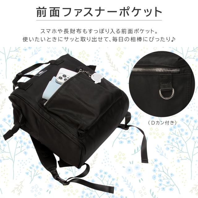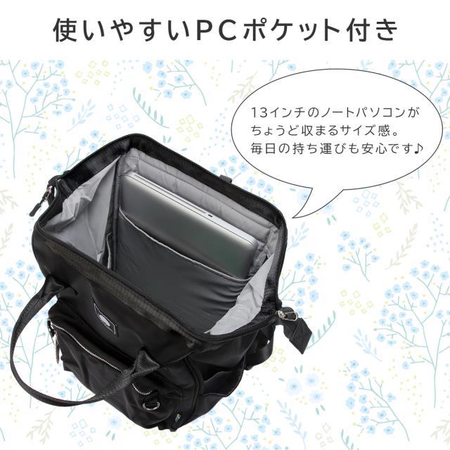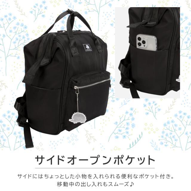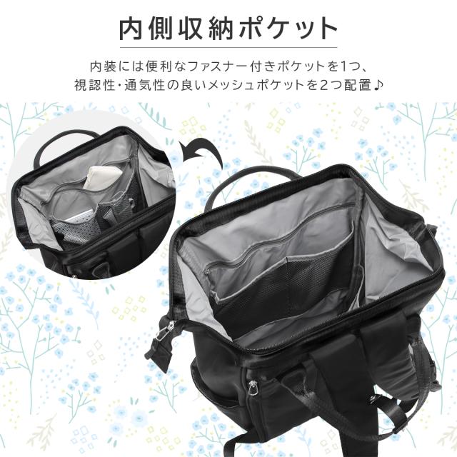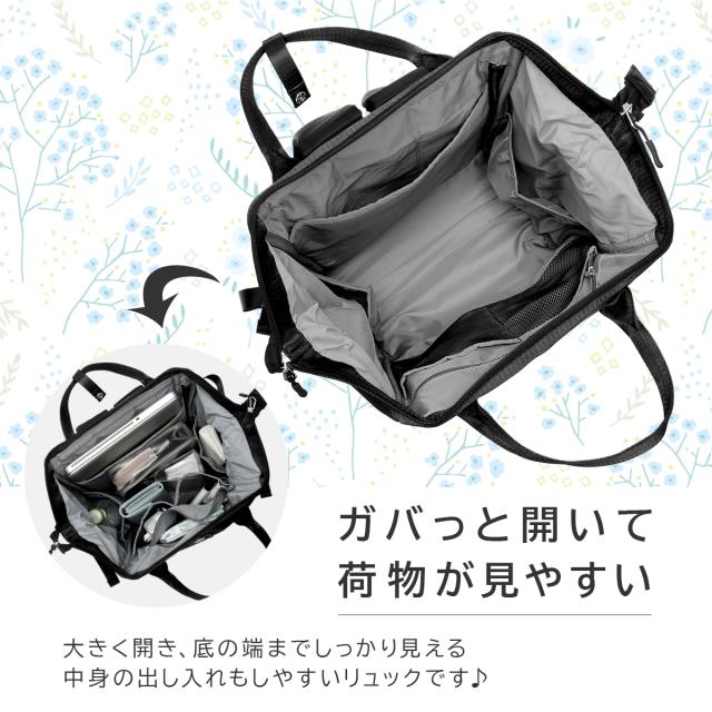 | がばっとひらく収納力ばつぐんのリュック◎ がばっと開いて、中身が一目瞭然!が特徴のとっても使いやすいリュックです。 そんな大きく開くメインエリアには13インチのPCが入るポケットに、 マグやペットボトルが入れやすい2つのオープンポケット、 ファスナー付きポケットと、2つのメッシュポケットの計6つのポケットがあり、 荷物が多くても整いやすい仕様です。 内装がグレーなのも中身がわかりやすくて嬉しい♪ リュック背面にはセキュリティが気になる貴重品などを入れるのにおすすめな独立したファスナー付きポケットと、上部を開かなくてもメインエリアにアクセスできる貫通ファスナーが! リュックを背負っていても片手でファスナーが開けられます。 ショルダーベルトは肩の負担を軽減する構造になっている上にバックルを採用しているため、 例えば抱っこ紐を背負っている時でもリュックを下ろしやすい仕様で マザーズバッグとして使用していただくのにも便利なリュックになっています! お仕事にも、お出かけにも、マザーズバッグとしても...色々なシチュエーションにおすすめできるリュックです◎ |