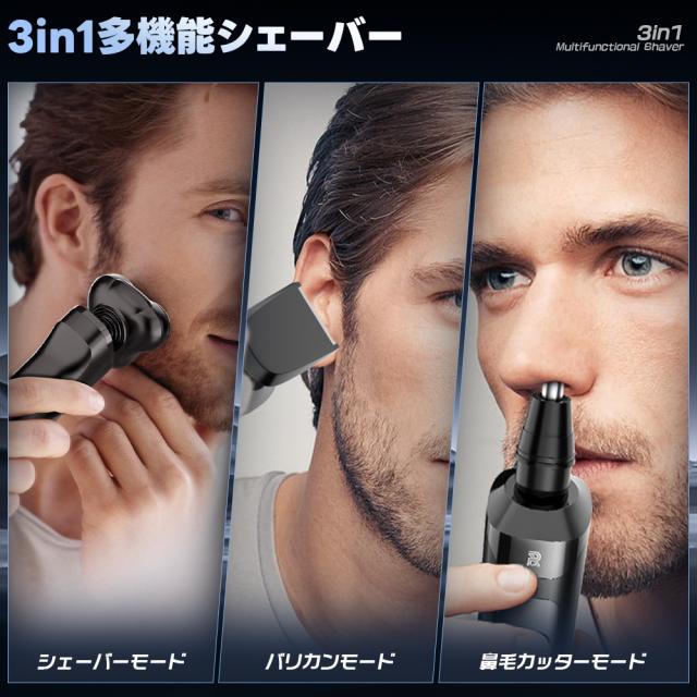【3in1電気シェーバー・3D回転式360°】 メンズシェーバー は髭剃り、バリカン、鼻毛カッターの3つの機能を1台に凝縮した多機能モデルです。360°回転ヘッドの設計により、顔の凹凸に密着し、快適な深剃りや早剃りが可能です