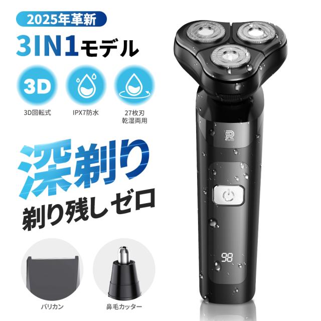 【2025新登場&回転式シェーバー】シェーバー メンズ 髭剃り 27枚刃 乾湿両用 360°回転式 電気シェーバー 低騒音 電動シェーバー ひげ剃り 深剃り IPX7防水 水洗い可 type-c充電式 電気カミソリ LCD残量表示 軽量 持ち運び便利 出張/旅行/プレゼント 日本語取扱説明書付