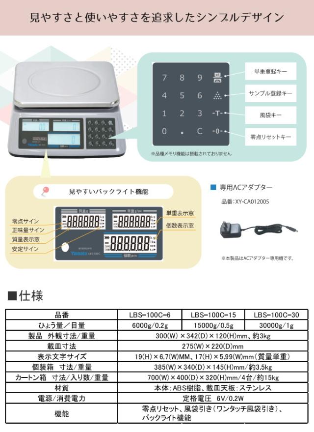 | ひょう量/目量 | LBS-100C-6:(約)6000g/0.2g LBS-100C-15:(約)15000g/0.5g LBS-100C-30:(約)30000g/1g |
