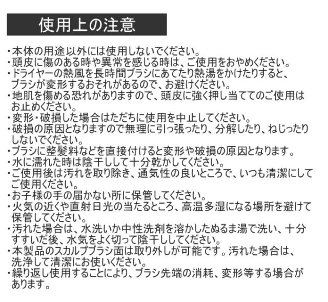 | 注意 | 頭皮に湿疹、傷などがあるときや使用中に異常を感じた場合はご使用にならないでください。 ドライヤーの熱風を長時間ブラシにあてたり熱湯をかけたりしないでください。(耐熱温度90℃) 地肌を傷めるおそれがあるので、頭皮に強く押ててのご使用はおやめください。 ご使用後は汚れを取り除き、通気性の良いところで、いつも清潔にしてご使用ください。 火のそばや、高温多湿、直射日光の当たる場所には置かないでください。 |