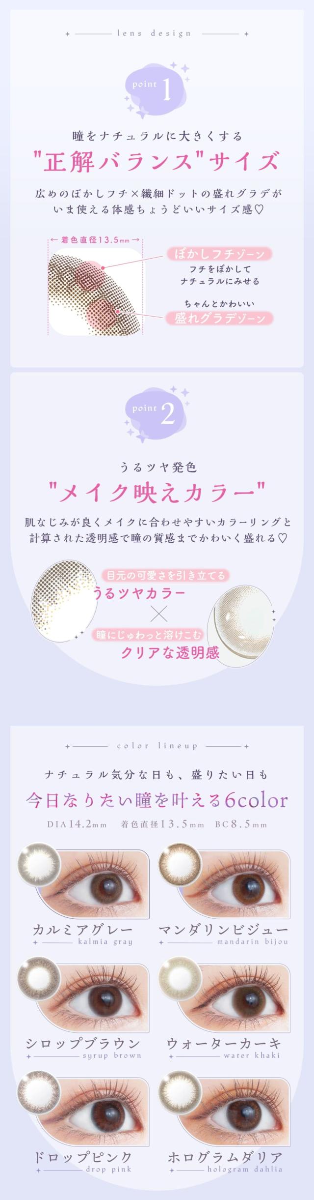 ■カラー:カルミアグレー/マンダリンビジュー/シロップブラウン/ウォーターカーキ/ドロップピンク/ホログラムダリア