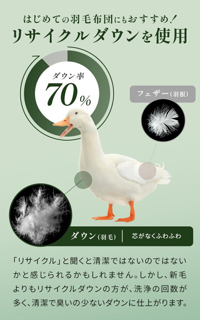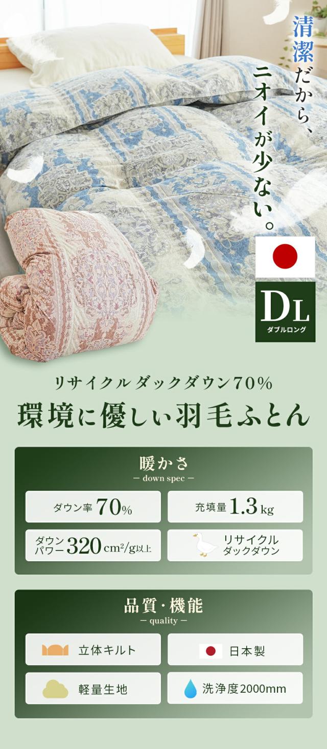 [keyword| 羽毛布団 ダブルロング ダウン70% リサイクルダックダウン 日本製 立体キルト 軽量生地 洗浄度2000mm パワーアップ加工 ダウンパワー320cm2/g 環境に優しい 清潔 ニオイ少ない]