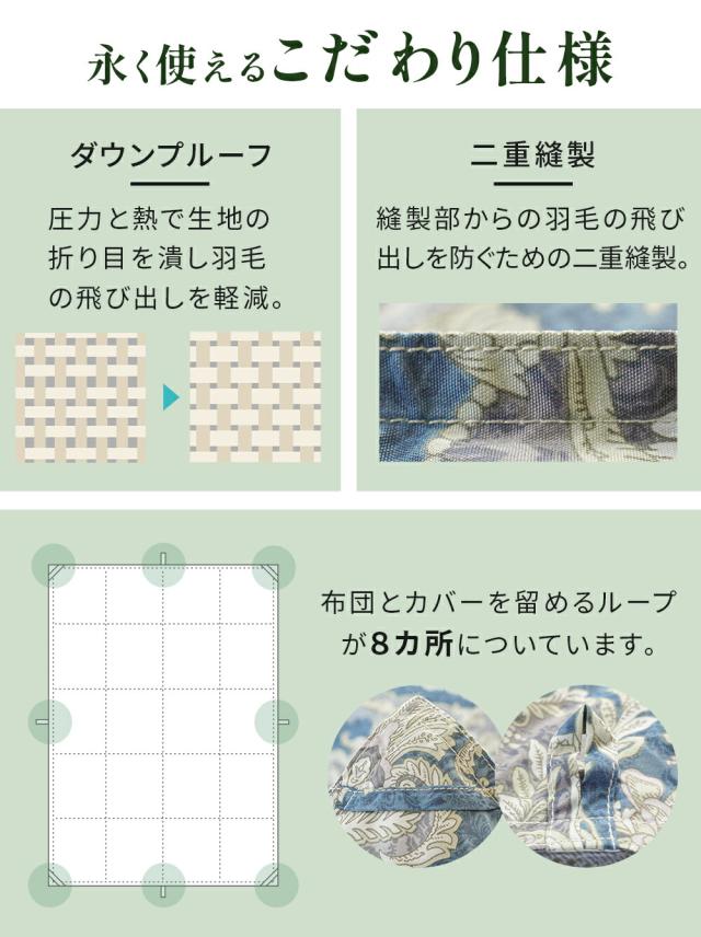 | ・はじめての羽毛布団にもおすすめ!リサイクルダウンを使用 羽毛は再生可能な資源なのでリサイクルダウンとして再利用できます。 羽毛の洗浄にすすいだ水を試験管に入れ、どの深さまで底が見えるかで測ります。500mm以上が合格となり、清浄度の数値が高いほど清潔で綺麗な羽毛であることを表します。 ・暖かさを逃がさない立体キルト羽毛の持つふくらむ力を存分に発揮するため、羽毛の小部屋を立体的につくったキルトです。 圧縮されて輸入される羽毛を専用の機械にかけ、蒸気や熱の力でゴミやダニ・細菌を消滅させ羽毛本来のふわふわな状態に復元させました。 ・使いやすさにこだわった軽量生地軽い生地だから中のダウンへの布団を軽減し、ダウンパワーを最大限引き出し快眠へ導きます。 | |