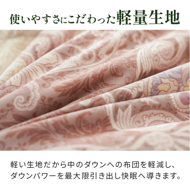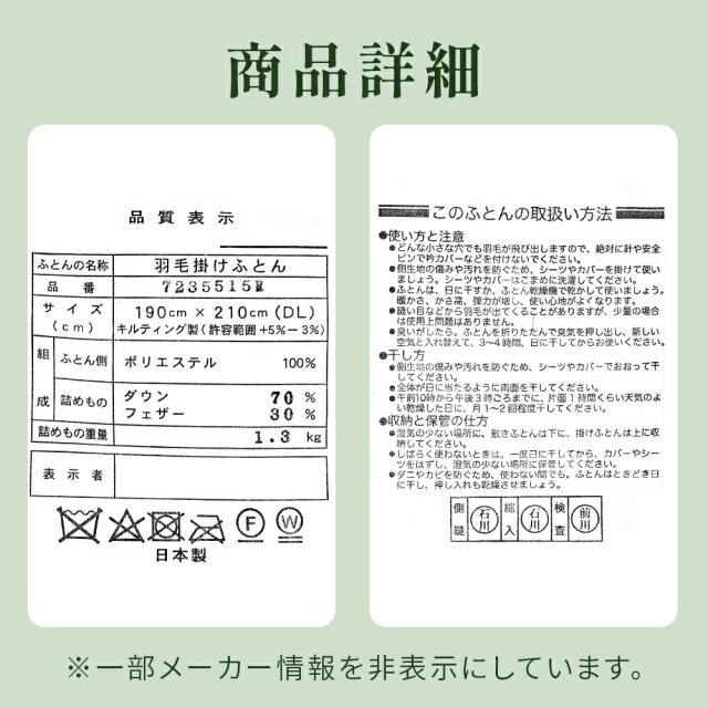 | 組成 | ふとん側:ポリエステル100%/詰めもの:ダウン70%、フェザー30% |
