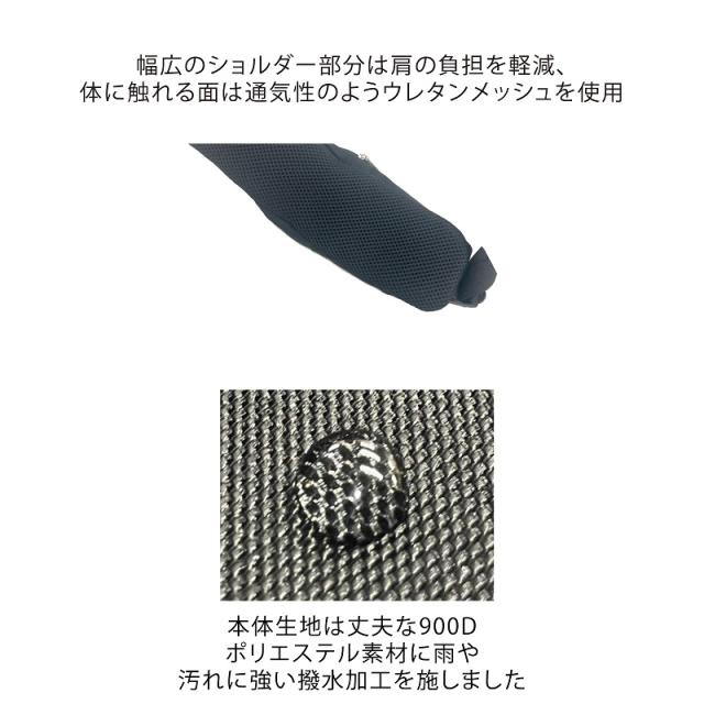 ショルダーベルトと背面はクッション性のあるメッシュ素材で蒸れにくい仕様。