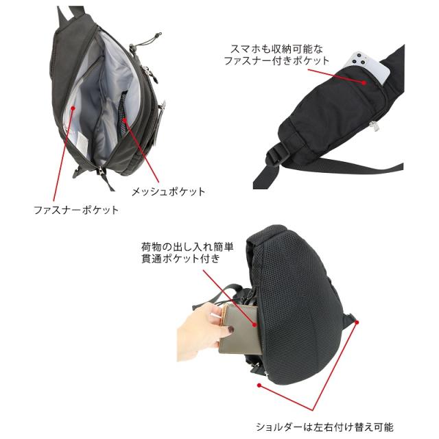 ショルダーベルトは左右の付け替えが可能。 ショルダーベルトに携帯等や小物を収納できるファスナーポケット、オープンポケット付き。
