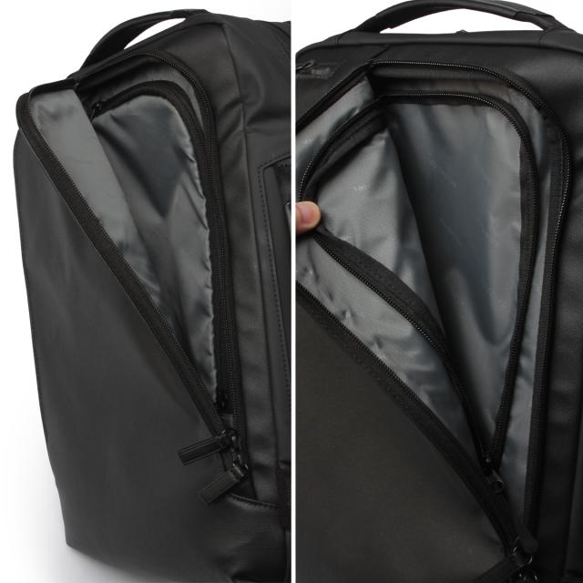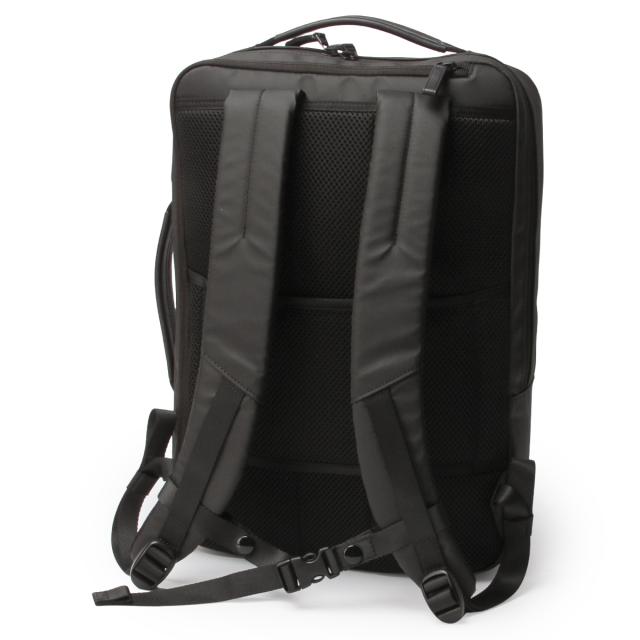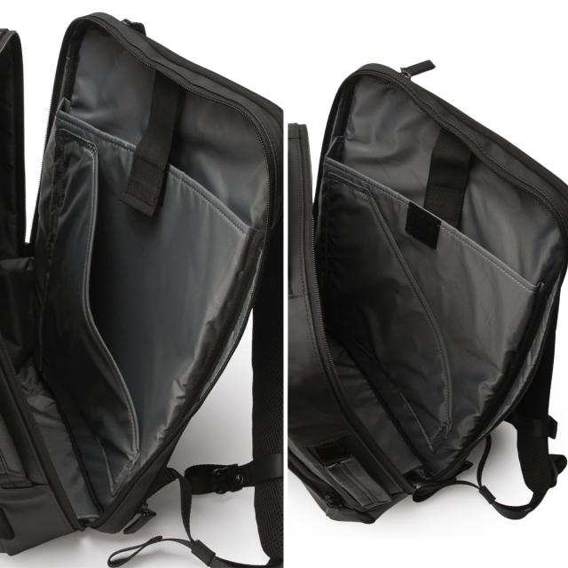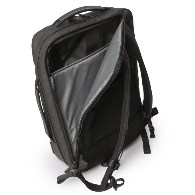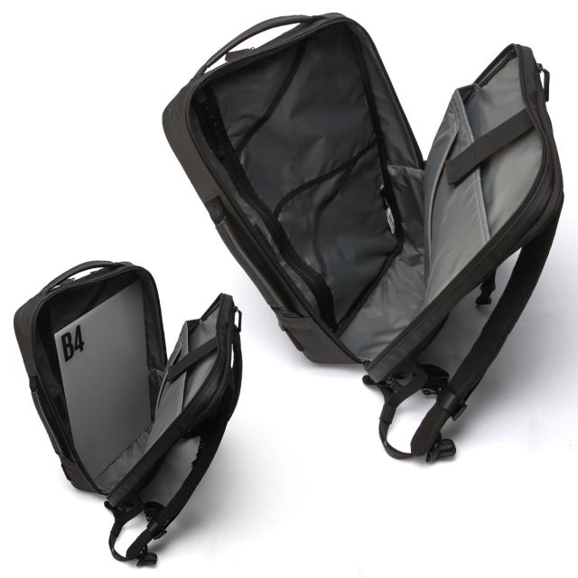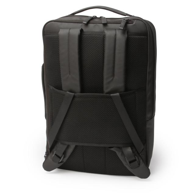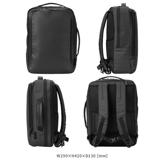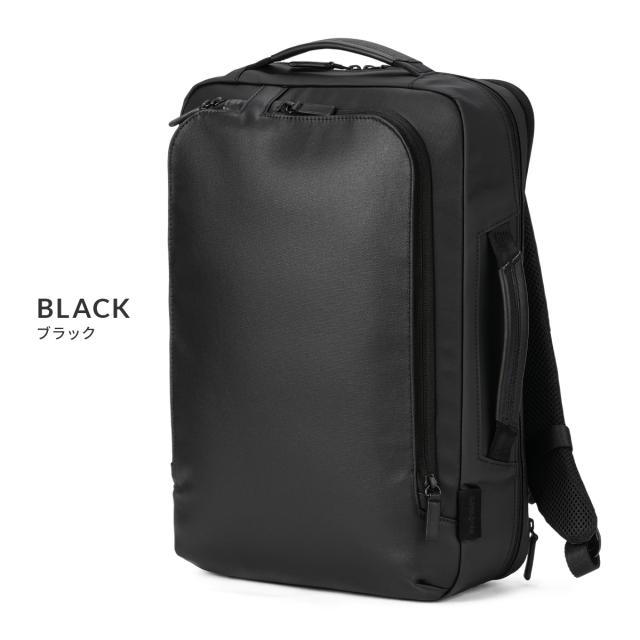 | 2WAY仕様 バックパック&ブリーフケース メインはバックパックながら、ショルダーをスリーブに差し込むことでブリーフケースへと変化する2WAY仕様のコレクション。ビジネスからカジュアルまで幅広く対応します。 15.6インチPCの収納に対応し、縦横どちらからでもアクセスできる設計。背面にはスーツケースにセットできるスマートスリーブを搭載し、出張や旅行時の移動も快適です。 主素材にはナイロンツイル、フロントにはキャンバス地を採用。いずれもポリカーボネートコーティングを施して耐水性を高めており、一見レザーのような質感が特徴です。 内装には抗菌加工が施され、回収PETボトル100%を原料とする再生ポリエステルを使用。環境への配慮と清潔性を兼ね備えています。 フロント右側にはL字型のファスナーポケット、左側には防水素材を使用したポケットを装備。折りたたみ傘やボトルの収納に便利です。(※完全防水ではありません) |