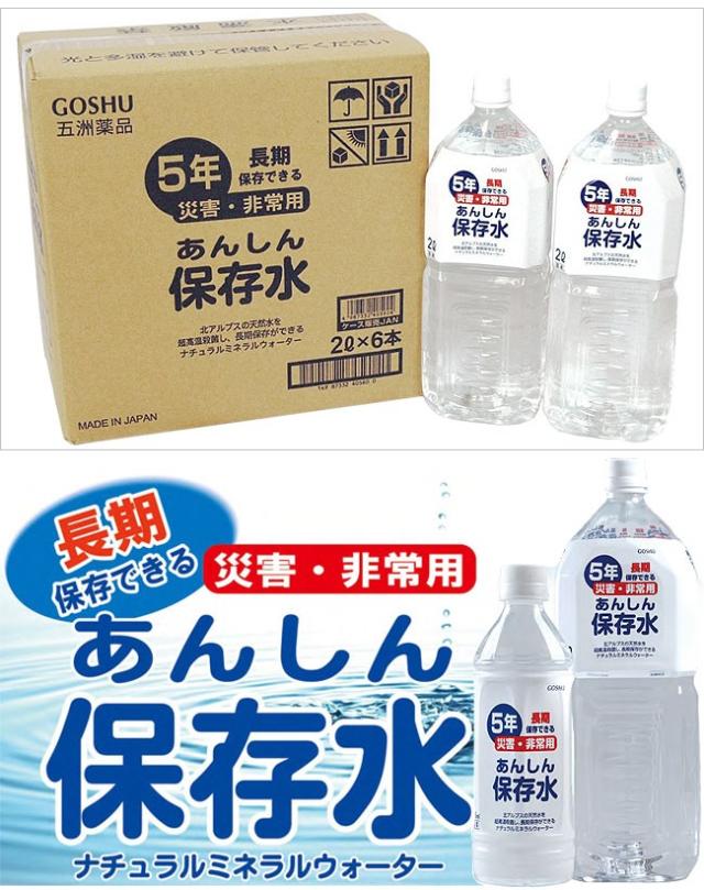 あんしん保存水 5年 2l 6本 ケース ペットボトル 送料無料 ミネラルウォーター 水 2リットル 天然水 備蓄水 2L 防災グッズ 防災 保存 備蓄 災害 災害対策 地震 地震対策 アルプス 立山 箱入 車載 国産 あんしん 五洲薬品