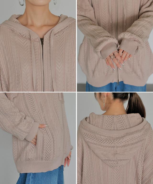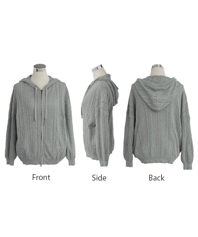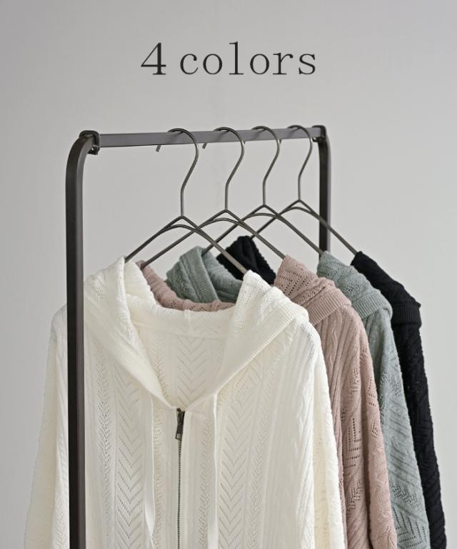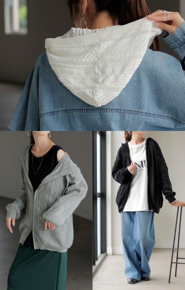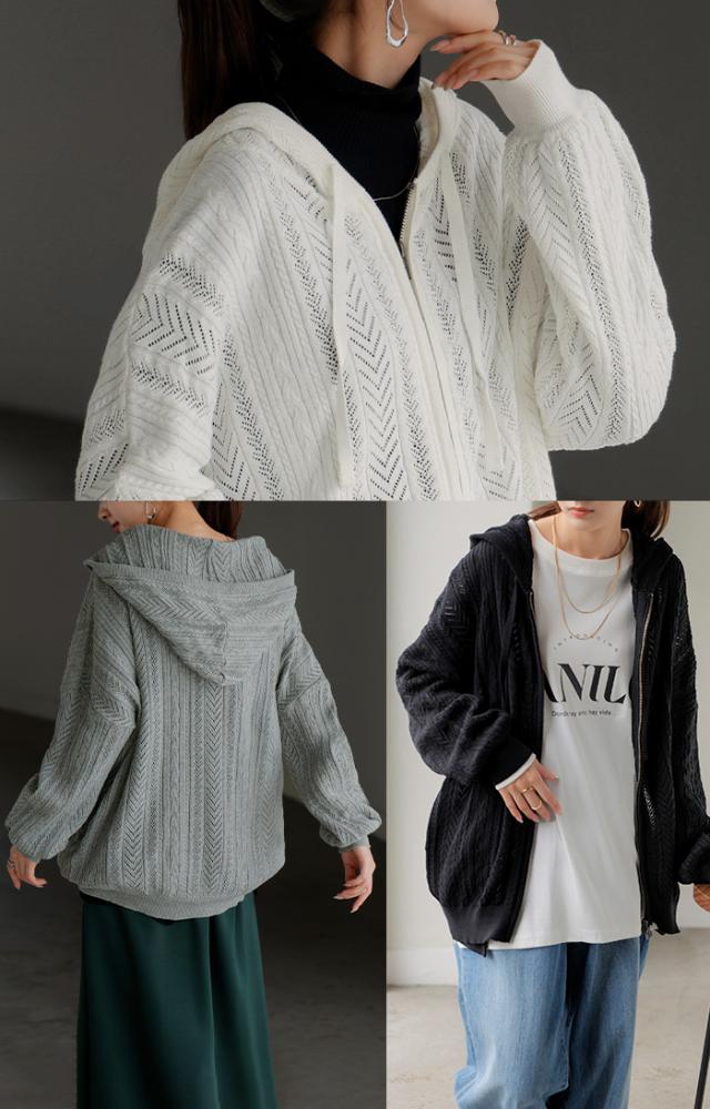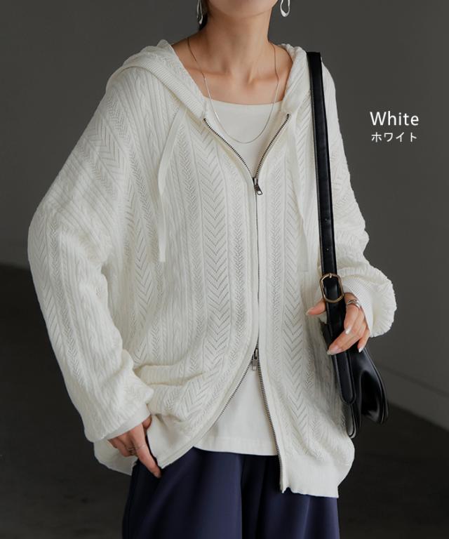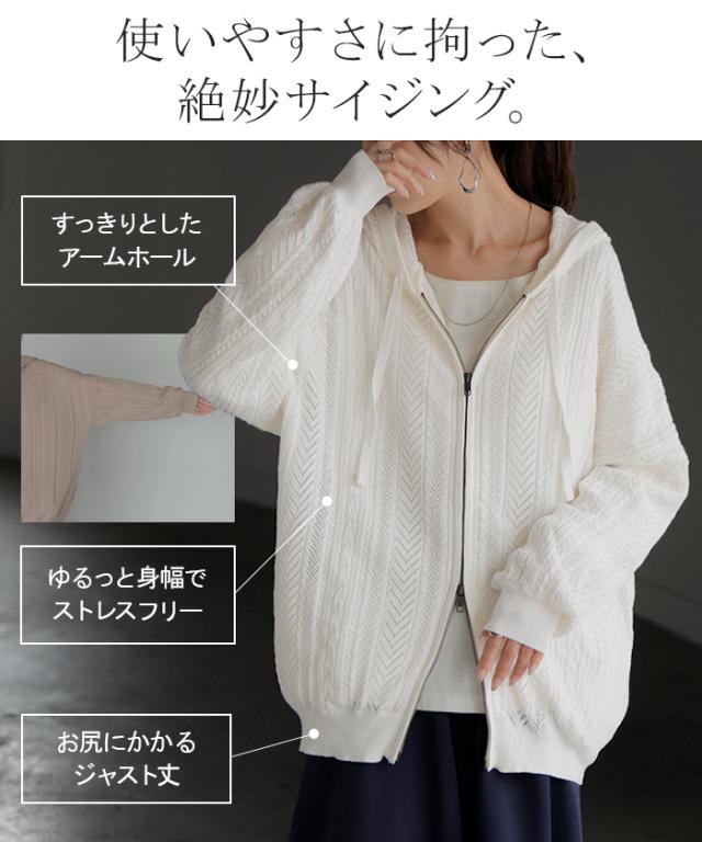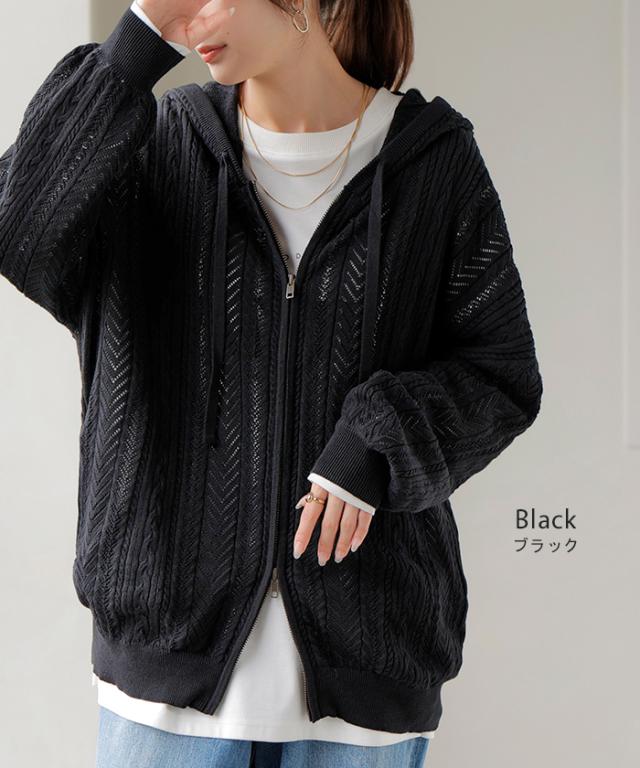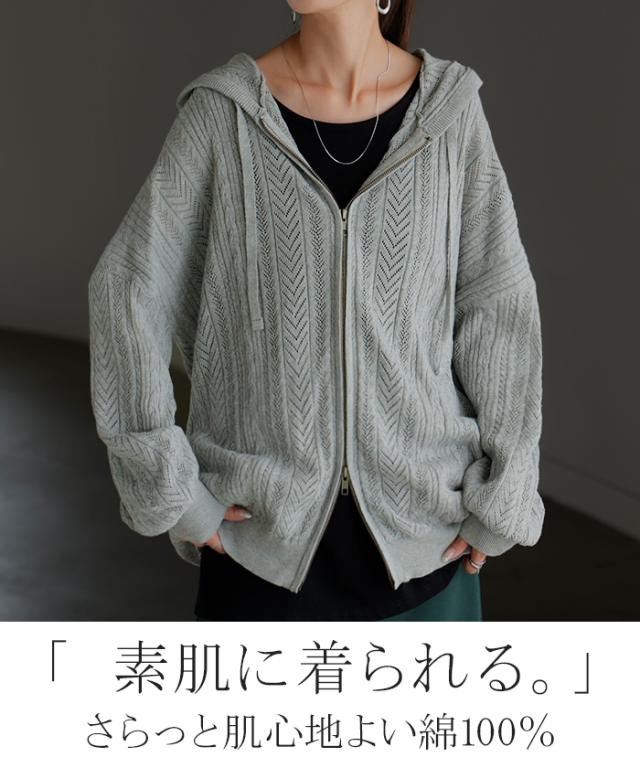 2025AW新作 “ ジャスト丈 ” パーカー ニット 綿100 ニットパーカー アウター レディース ライトアウター 透かし編み トップス セーター プルオーバー パーカー フード フーディー ドルマン ゆったり 羽織 体型カバー シアー 黒 白 秋 冬 HUG.U 秋新作