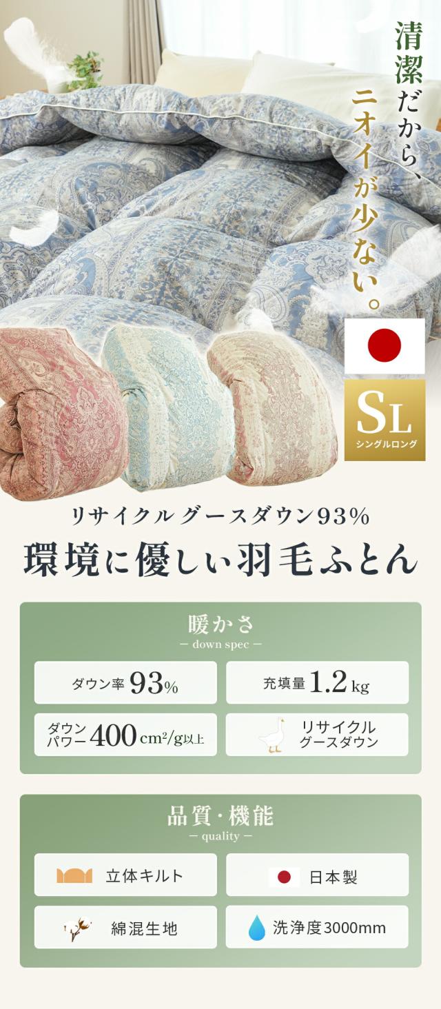 [keyword| 羽毛布団 シングルロング ダウン93% リサイクルグースダウン 日本製 立体キルト 綿混生地 ピーチスキン加工 洗浄度3000mm パワーアップ加工 ダウンパワー400cm2/g 環境に優しい 清潔 ニオイ少ない]