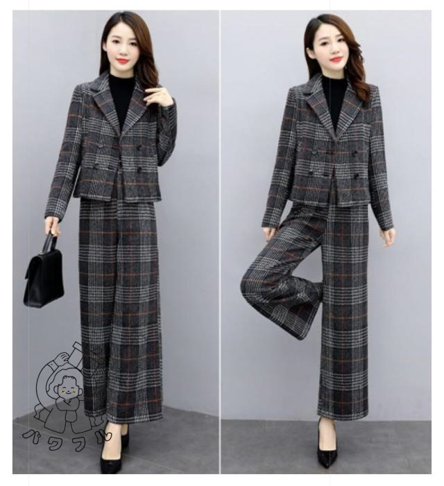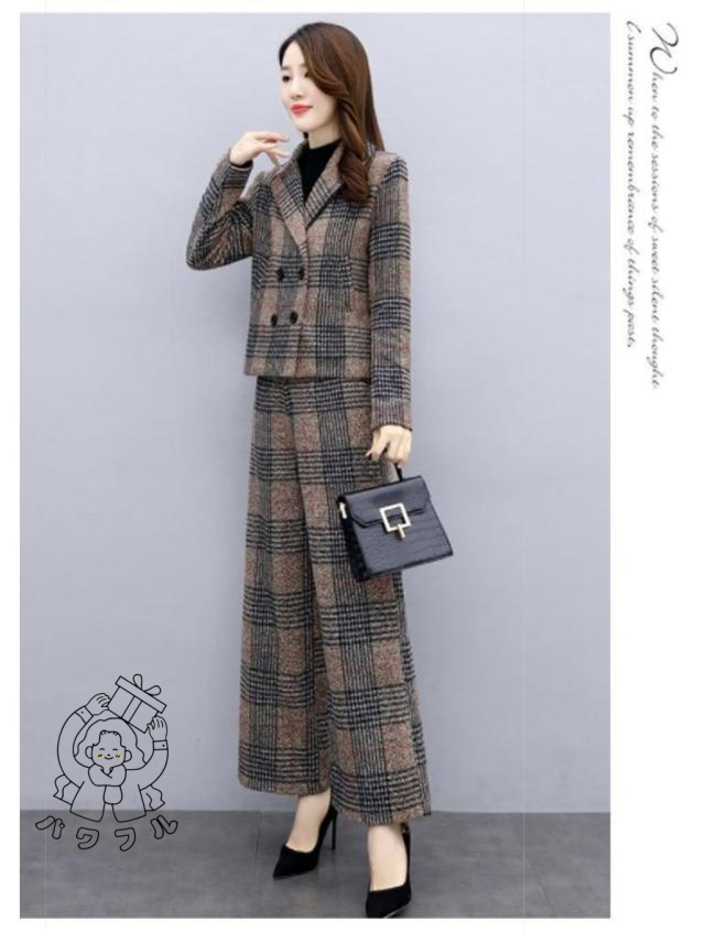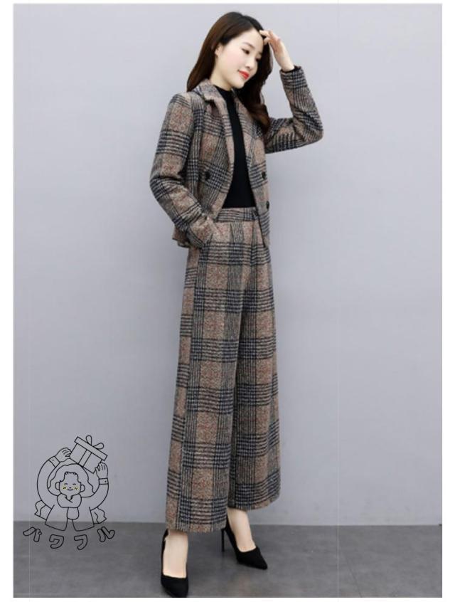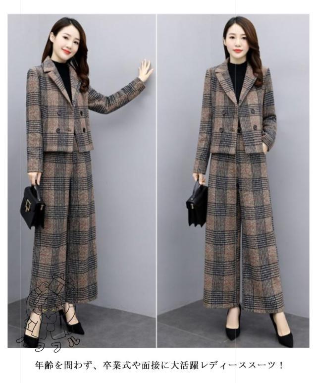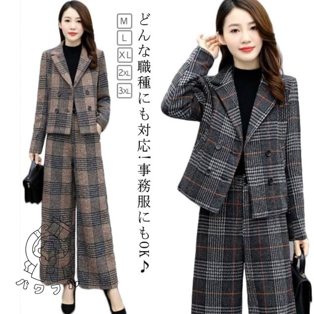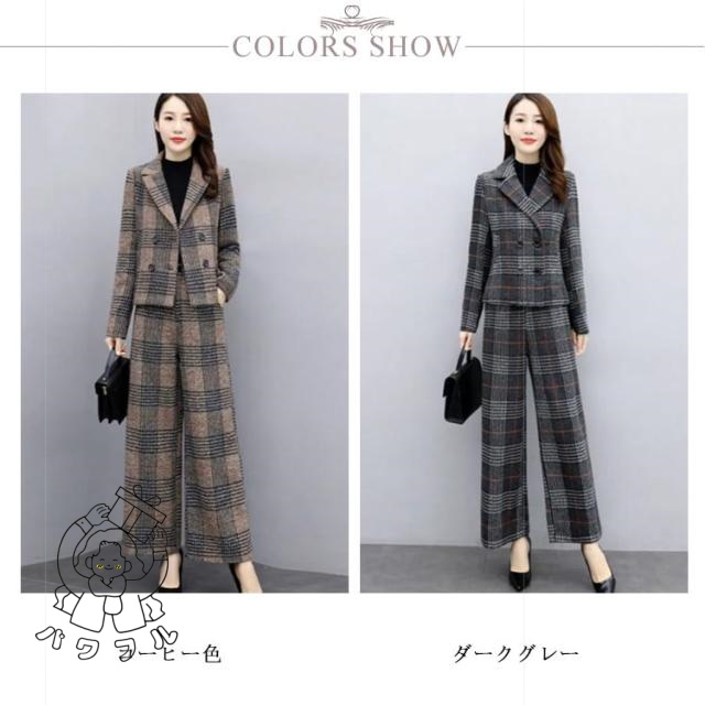 秋冬 フォマール ガウチョパンツ 二次会 結婚式 オフィス ビジネス 通勤 コート+ワイドパンツ 送料無料 女性 着痩せ セットアップ レディース 母親 上下セット OL チェック柄 お呼ばれ パンツスーツ カジュアル ゆったり 長袖 パンツドレス 無地