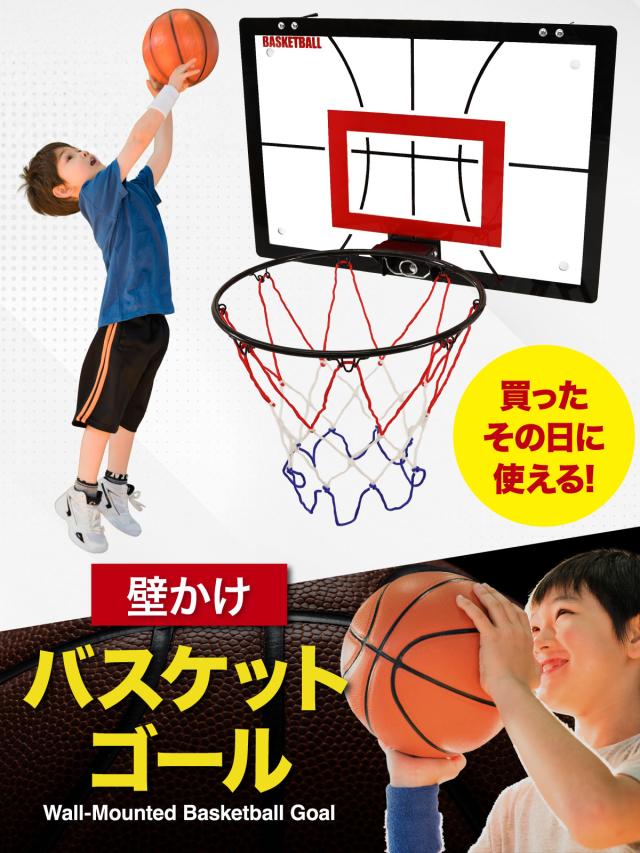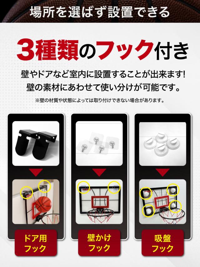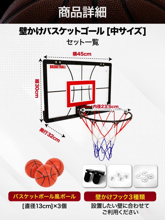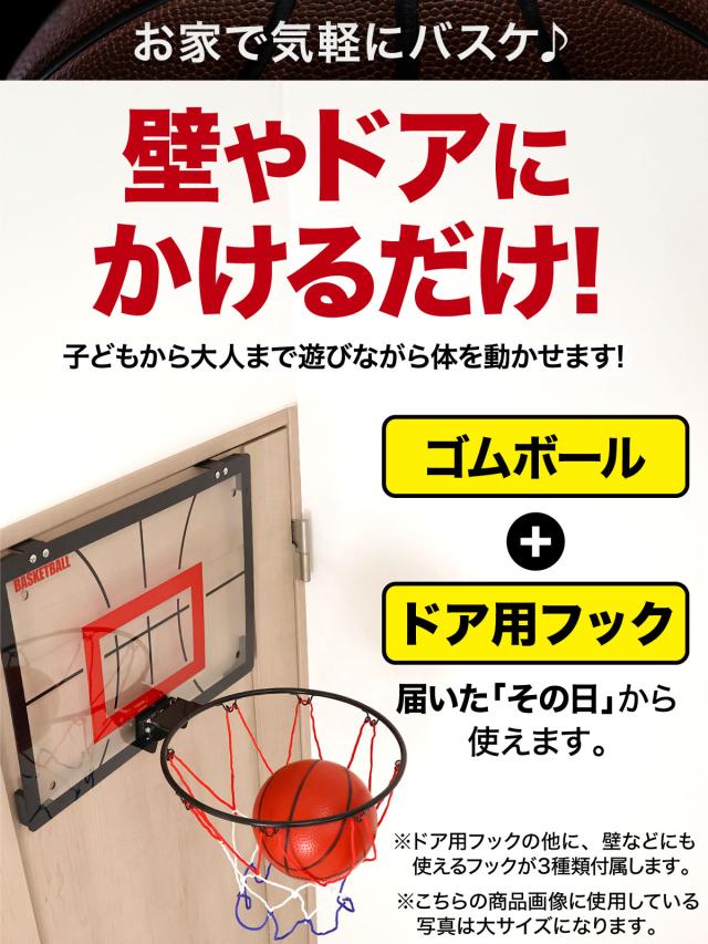 | セット内容 | 壁かけバスケットゴール一式、壁かけフック3種(壁に合わせてご利用ください)、バスケット風ゴムボール×3個、ゴムボール用空気入れ |