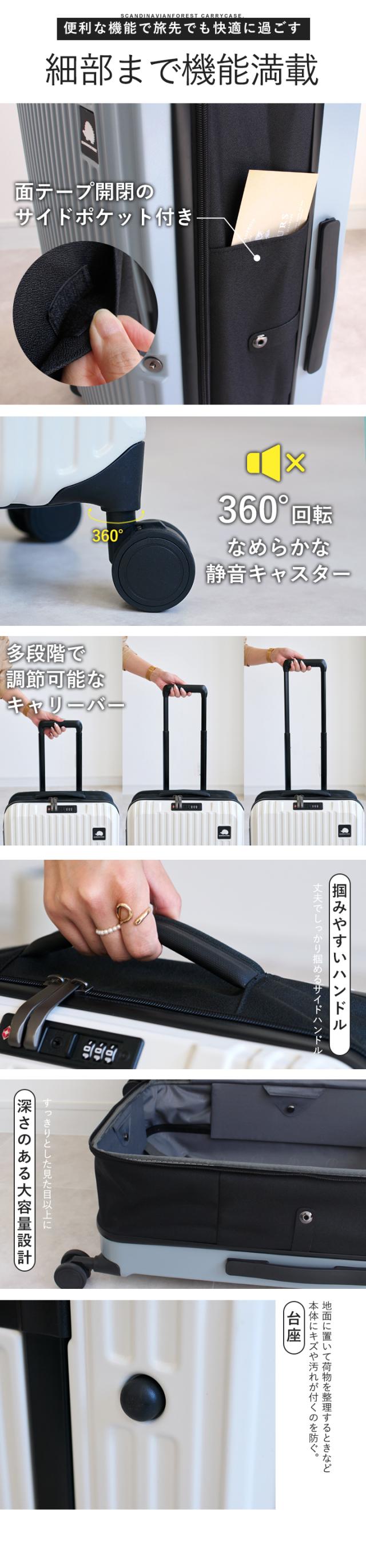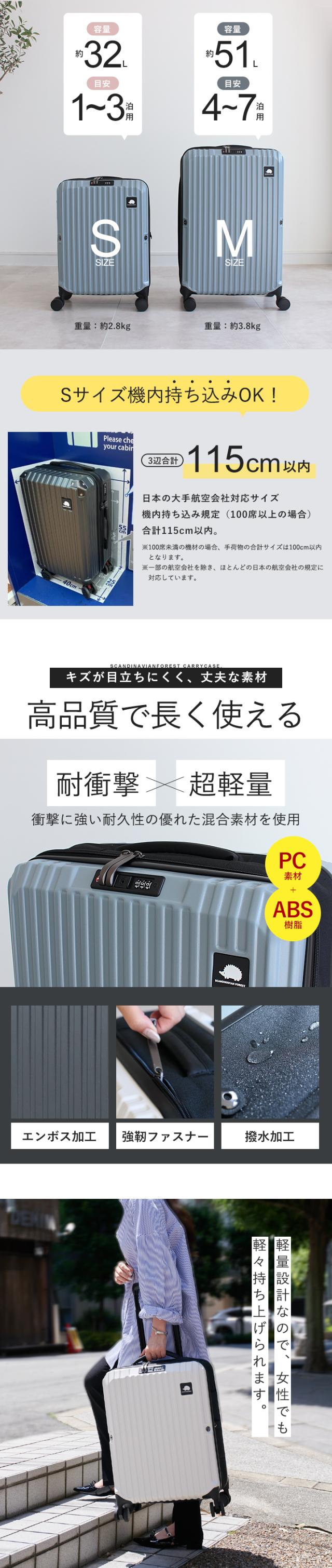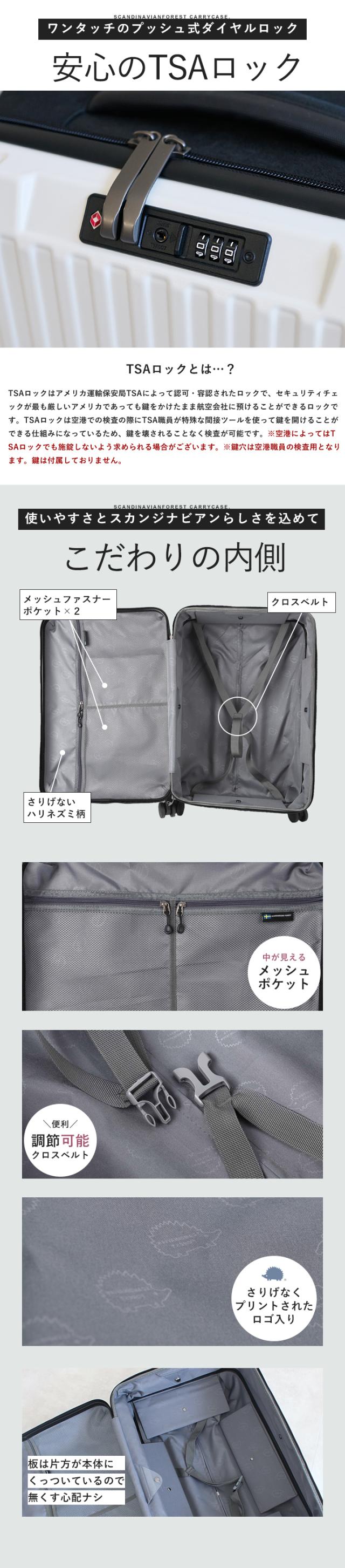 | 備考 | 人気北欧ブランド「SCANDINAVIAN FOREST」から初のスーツケースが登場しました。 傷が目立ちにくいエンボス加工が施された軽量で丈夫な素材を使用して、 可愛いハリネズミのロゴがアクセントになったシンプルなデザインは男女問わず幅広い世代におすすめです。 キャリーケースといえば使わないときの収納が悩み。 このキャリーケースは約半分に折りたためてスリムに収納できます。 TSAロック、調節可能なキャリーバー、360度回転のキャスターなど 使いやすいポイントも盛りだくさん。 |