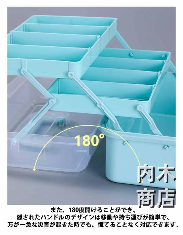| 3段式設計&仕切りがあるから上手に収納でき!! おしゃれで便利な大容量収納ケース ・軽量のPP素材で環境保護ができて耐久性もあります。長持ちで、防虫、防黴、防湿で、非常に耐久性がある。 ・3層トレーと仕切りで薬類をお好みで分類出来るので欲しい物が一目瞭然。 ・上段は仕切りのあるトレー付きなので、小さなお薬等の小分けに便利です。 ・下段には高さのある瓶やボトルもたっぷり収納できます。 ・フタが透明になっているため開けることなく中身がハッキリ見えます。 ・また、180度開けることができ、隠されたハンドルのデザインは移動や持ち運びが簡単で、万が一急な災害が起きた時でも、慌てることなく対応できます。 ・しっかり閉められるので持ち上げる際にフタが開いて中身が落ちる心配もありません。 ・薬箱だけでなく、化粧品や文房具も収納できます、透明ケースなので内容物が一目瞭然です! ・家族、病院、診療所、アウトドア、事務所など用に、常備薬をまとめてコンパクトに収納出来る救急箱です。 | |