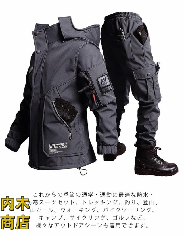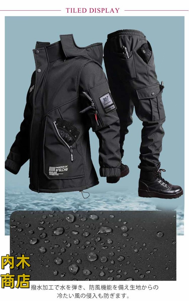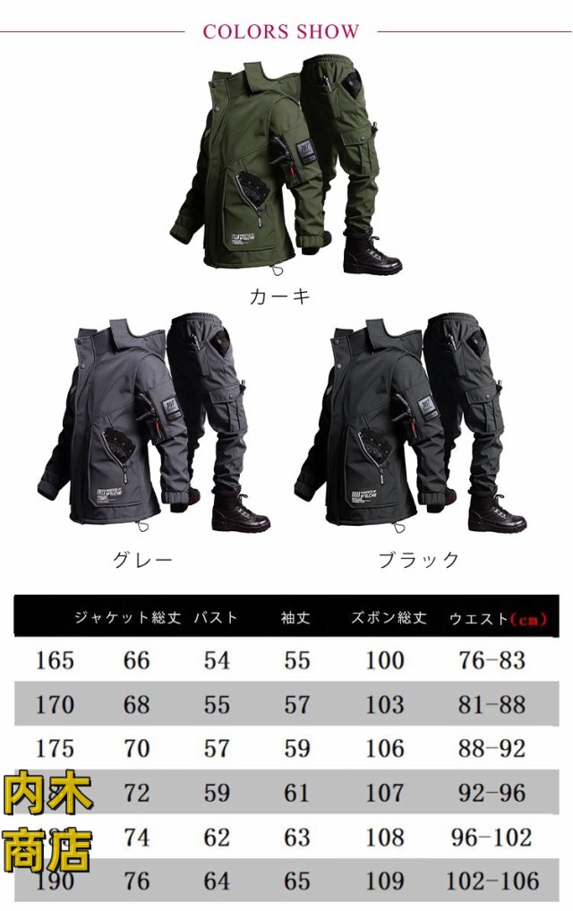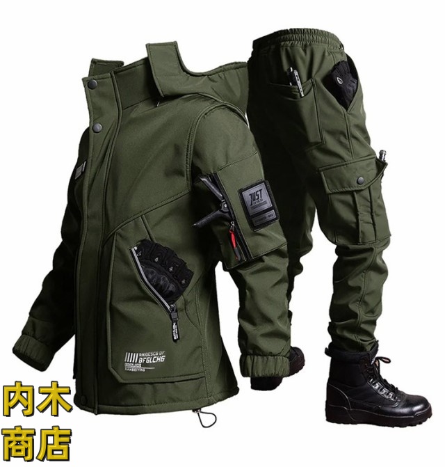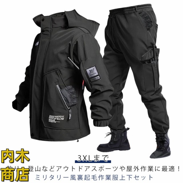 | 釣り、登山などアウトドアスポーツや屋外作業に最適!ミリタリー風裏起毛作業服上下セット。【3XLまで】 裏面優しい肌触りが特徴のボアフリースが使われているので風邪を通さず、保温性も兼ね揃えたアイテムに仕上げられております。 撥水加工で水を弾き、防風機能を備え生地からの冷たい風の侵入も防ぎます。 実用性の高いポケットがたくさん完備、手ぶらでお散歩なども◎ これからの季節の通学・通勤に最適な防水・防寒スーツセット、トレッキング、釣り、登山、山ガール、ウォーキング、バイクツーリング、キャンプ、サイクリング、ゴルフなど、様々なアウトドアシーンも着用できます。 | |