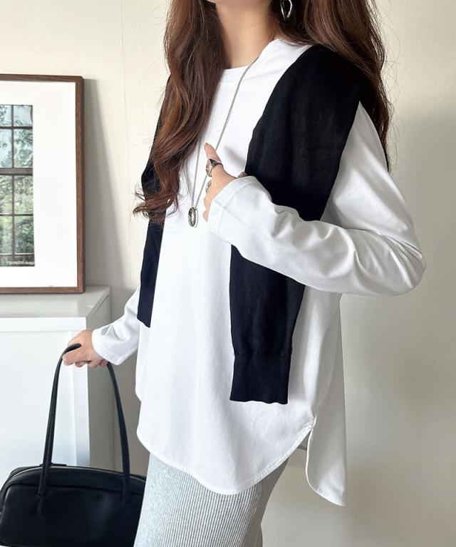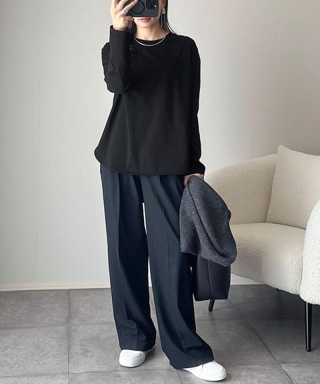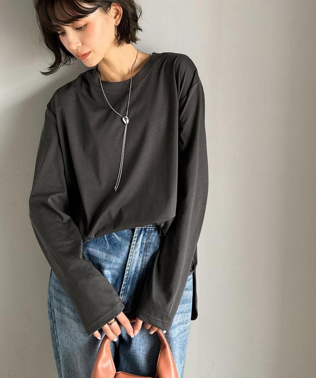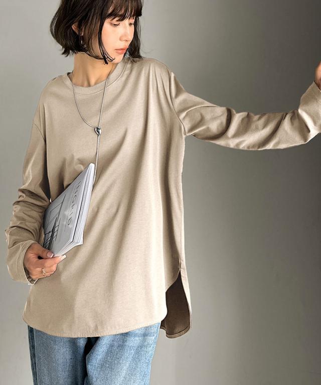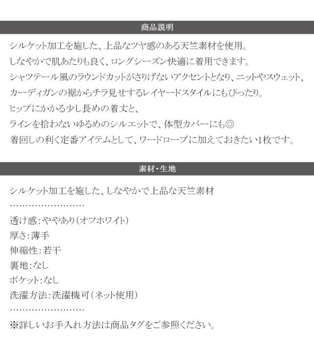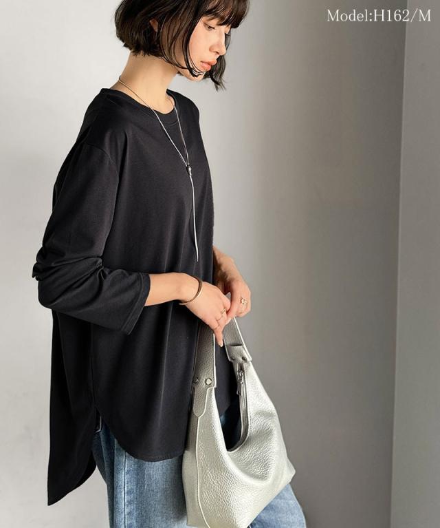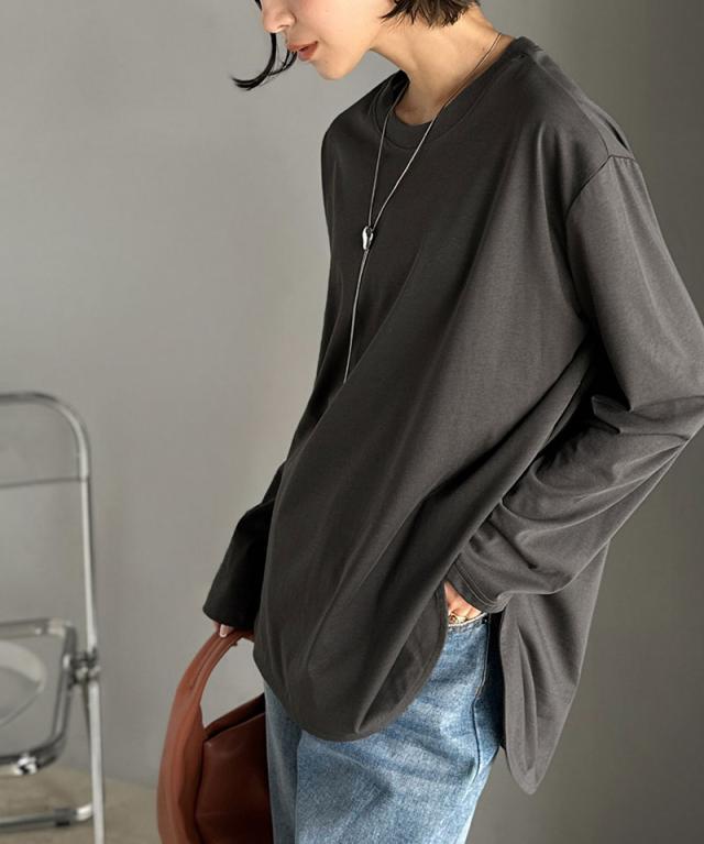 シャツテール風のラウンドカットがさりげないアクセントとなり、ニットやスウェット、