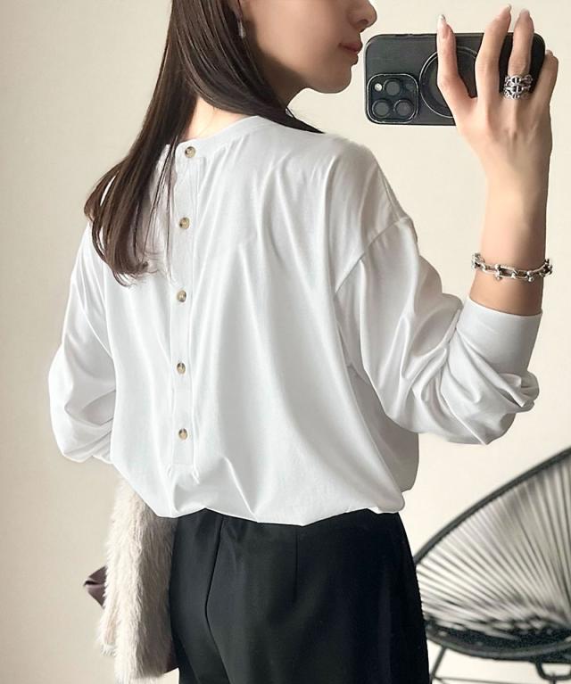 後ろに施されたボタンデザインがさりげないアクセントになり、バックスタイルまで抜かりない印象に。