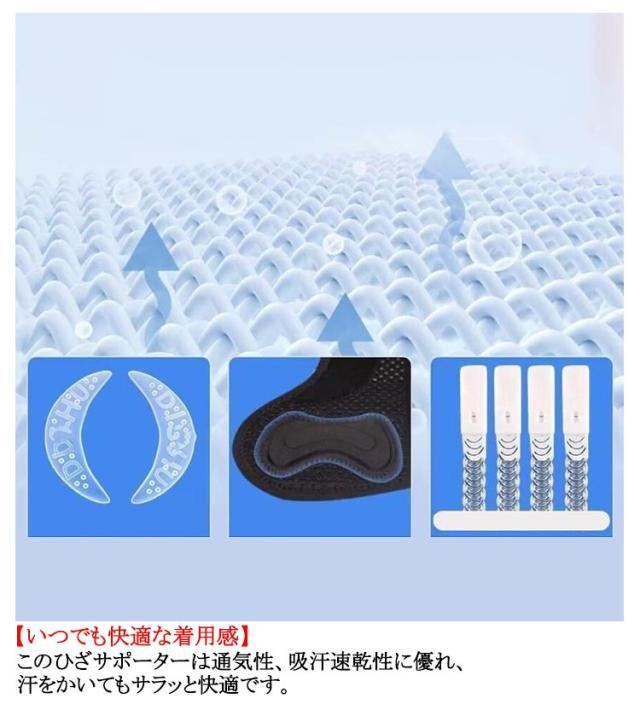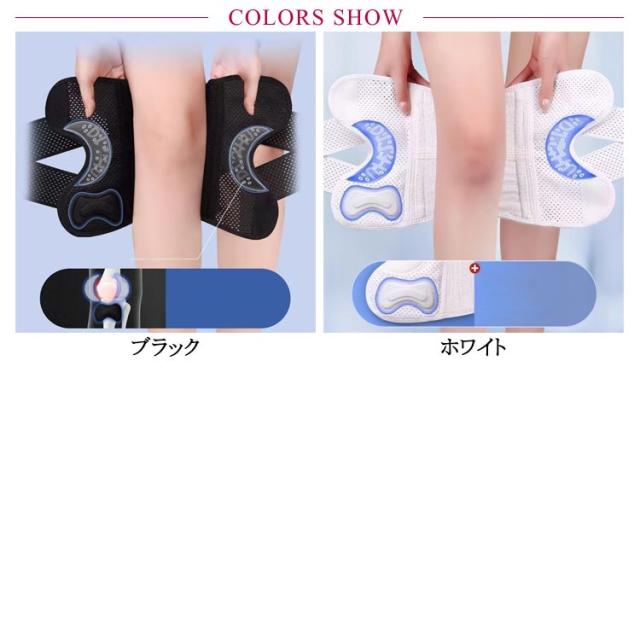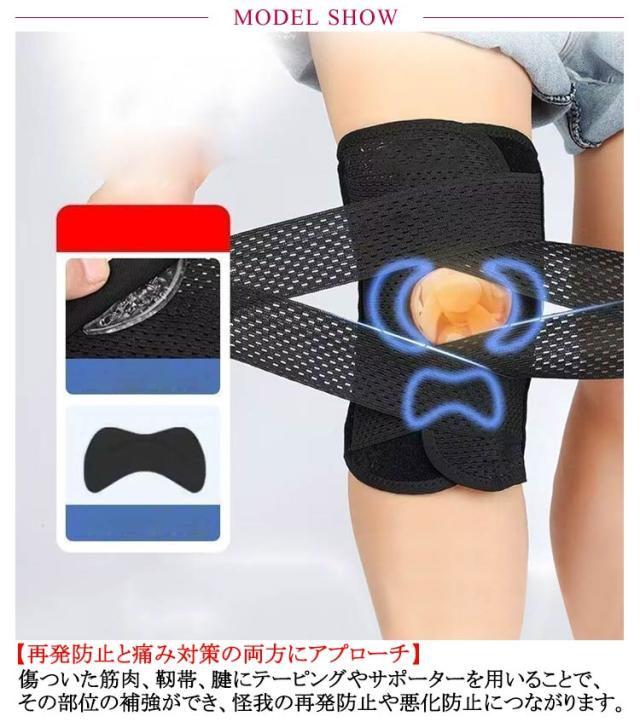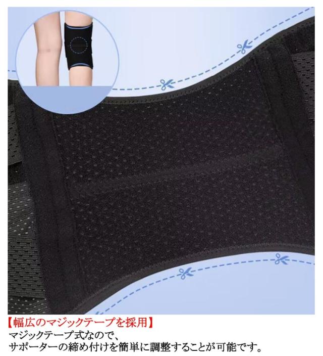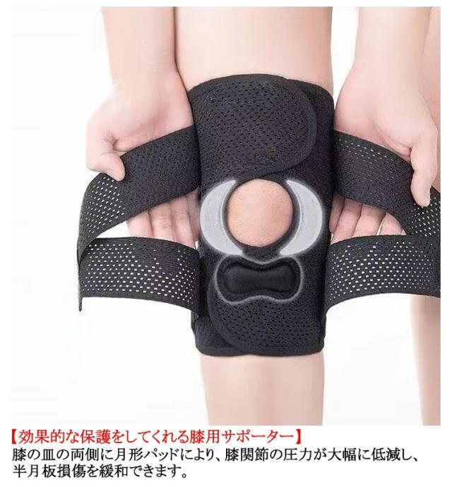 | 【再発防止と痛み対策の両方にアプローチ】傷ついた筋肉、靭帯、腱にテーピングやサポーターを用いることで、その部位の補強ができ、怪我の再発防止や悪化防止につながります。 【効果的な保護をしてくれる膝用 サポーター】膝の皿の両側に月形パッドにより、膝関節の圧力が大幅に低減し、半月板損傷を緩和できます。 【関節や筋肉、靭帯、腱をがっちり補強】膝に巻くV型マジックテープを2本、膝の上下に交差して、膝蓋骨の安定に役立ちます。左右のぐらつきも防止しながら、今までにない最高のホールド感を体験できる膝サポーター。 【デュアルスタビライザースプリング】膝サポーターの両側に2本ずつのスプリングを内蔵し、関節の自然な動きとともに流れるように設計されており、運動や激しい活動時に着用するのに理想的なブレースです。 【人間工学的なひざ用サポーター】曲げ伸ばしの多い膝頭や裏側は、食い込みを防いでカーブカット構造になっています。メッシュ生地採用ですので、ムレにくいのもポイントです。 【フロントオープンのデザイン】膝蓋骨のカーブに360°完全にフィットし、損傷の回復とスポーツによる怪我に。 【幅広のマジックテープを採用】マジックテープ式なので、サポーターの締め付けを簡単に調整することが可能です。 【簡単に着け外しOK】ボトムを履いたまま簡単に着け外しできるフルオープンタイプの膝サポーターです。 【様々なシーンに最適】ランニング、ジョギング、ジム、ウェイトリフティング、バスケットボールなど、数多くのスポーツで幅広く使用されている膝用サポーターです。また、手術後の回復のために運動する方や、長時間立ったり歩いたりする方にもお勧めです。日常生活で使用すると、24時間一日中サポートが受けられます。 サイズの選び方 普通に立った状態でメジャーでヒザのお皿の中心から、10cm上の太ももの太さに合わせ計測! 着用方法: 1.膝を伸ばした状態で、膝の裏側からサポーター本体を当てます。 2.膝を屈する時、サポーターの穴を膝のお皿の位置に合わせて、上下側の面ファスナーを引っ張り、サポーター本体にとめます。 3.加圧ベルトを後ろにまわし、膝下に当ててクロスさせます。 4.ベルト止めで固定します。 【いつでも快適な着用感】このひざサポーターは通気性、吸汗速乾性に優れ、汗をかいてもサラッと快適です。 | |