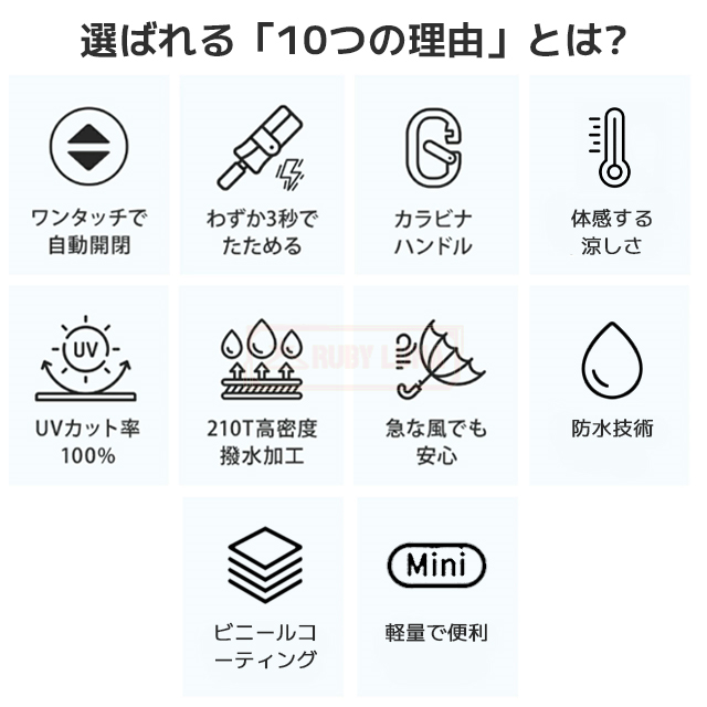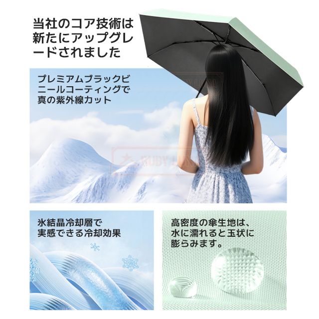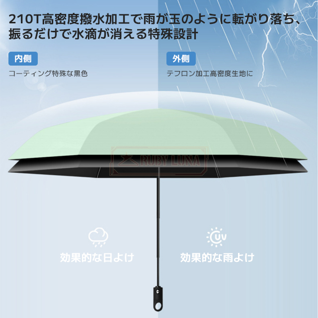 | 【晴雨兼用&超撥水加工】 | ◆急な雨にも対応する晴雨兼用傘。高密度生地に超撥水加工を施しており、水滴をサッと払えてすぐ収納可能。折りたたみ傘としても優秀で、通勤や通学、旅行にも最適です。 |