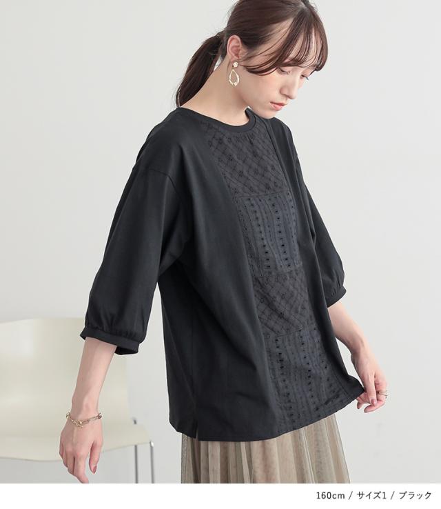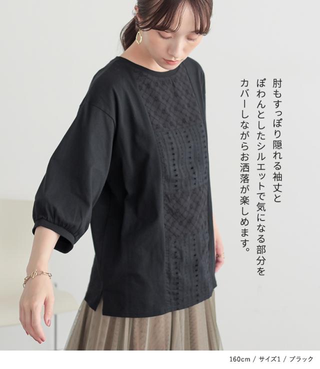 <冬新作>『コットンレース切替ぽわん袖カットソー』※メール便可※【10】[カットソー 七分袖 五分袖 レディース トップス 汗じみ防止 汗じみ Tシャツ レース ぽわん袖 小花柄 幾何学柄 綿100% ゆったり 秋 夏 春]