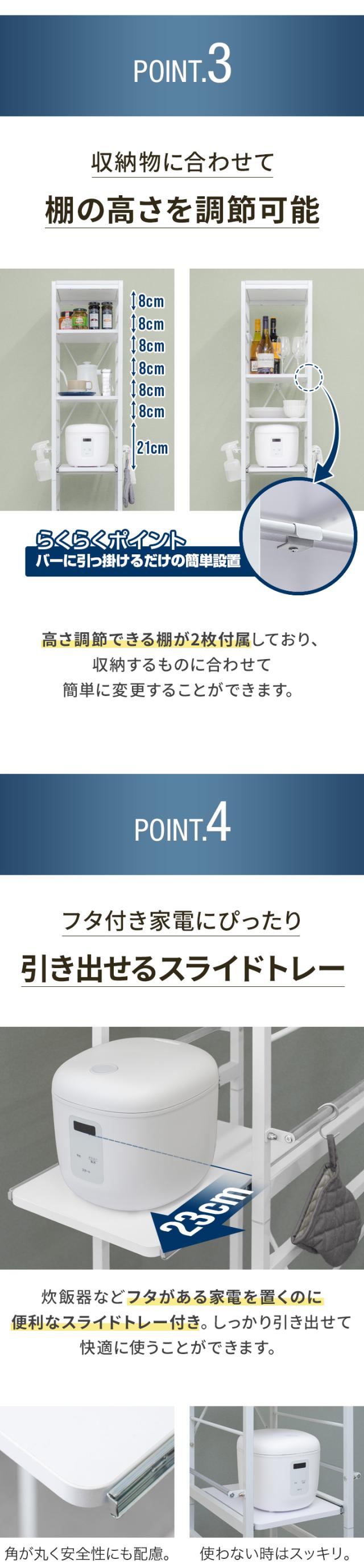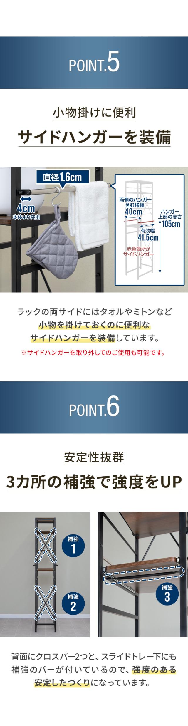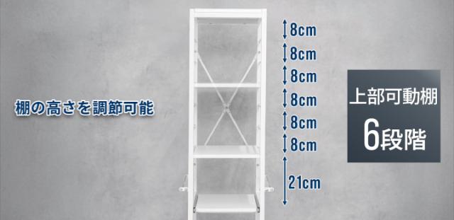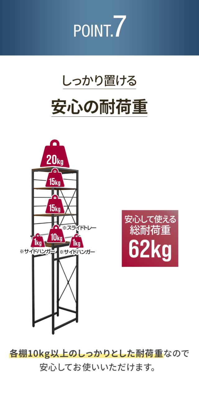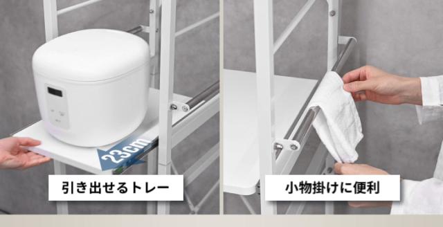 | 耐荷重: 最上段:20kg 可動棚:各15kg スライドトレー:10kg サイドハンガー:各1kg |