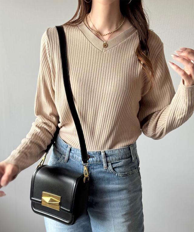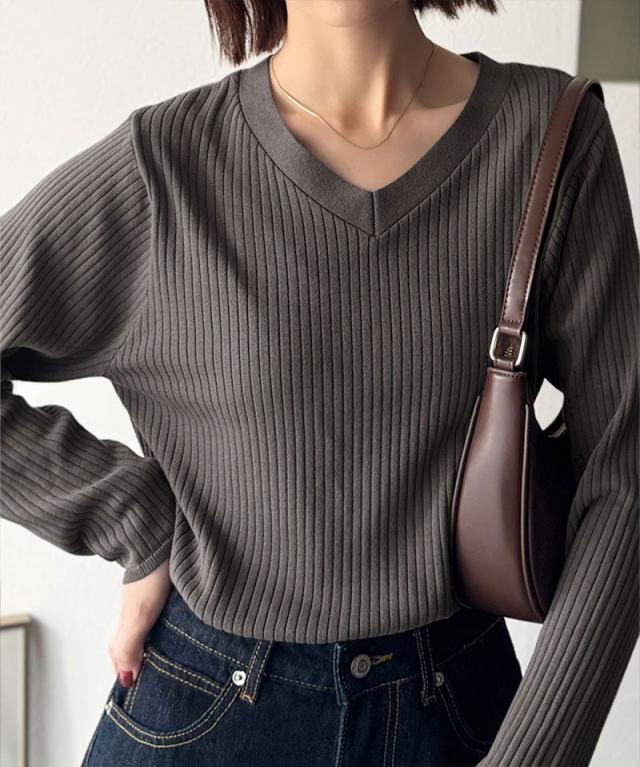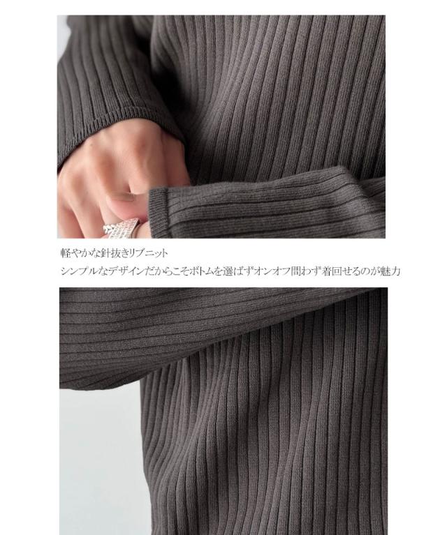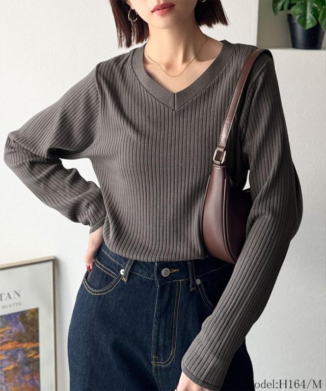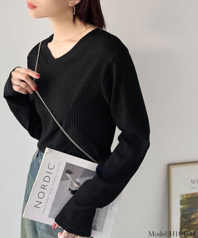 針抜きリブを使用したニット素材で、軽やかに着こなせるVネックトップス。