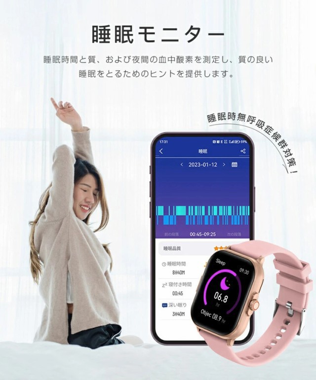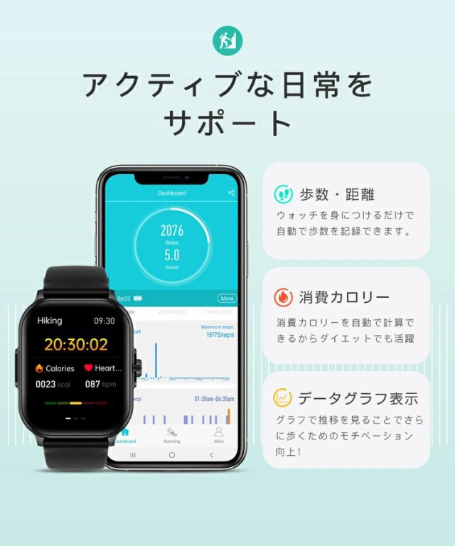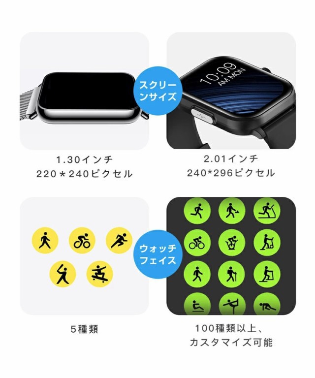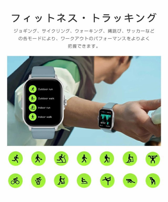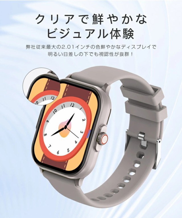 【高級感溢れる曲面スクリーン&超軽量薄型】 スマートウォッチが2.01インチ大画面を採用して、驚くほど鮮明で、美しくリアルな画面を実現しました。画面の明るさ調節も可能で、強い日差し下にも視認性が高く、見やいです。 腕上げ点灯機能で、腕の振り上げ動作でスマートウォッチの画面が自動点灯するので、時刻を確認する時に便利です。薄と超軽量の設計で、運動中も負担にならず超快適に装着できるスマートウォッチ、 レディースにもメンズにも適します。