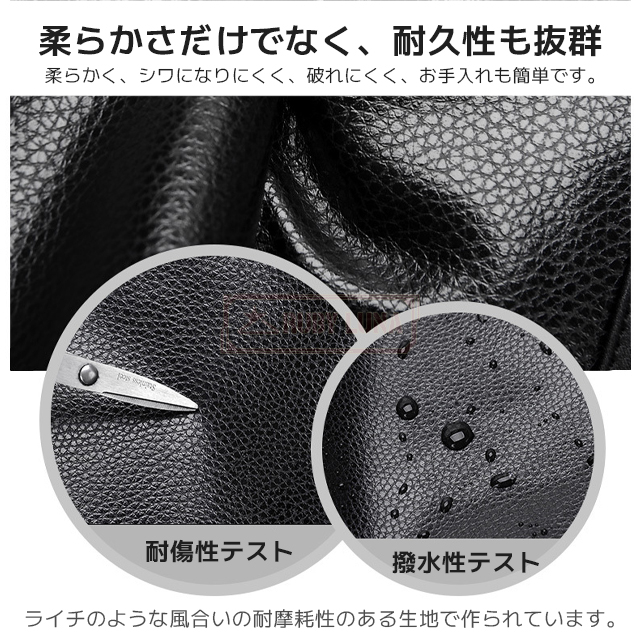 | 【撥水加工】 | ◆耐久性・撥水効果あるため、突然の雨やうっかりこぼしたコーヒーもサッと拭き取れます。 ◆※完全防水ではありません、縫い目から水は染み込みますので、水に浸けたりはしないでください。 |
