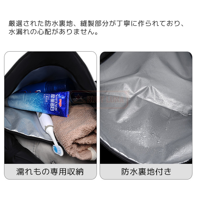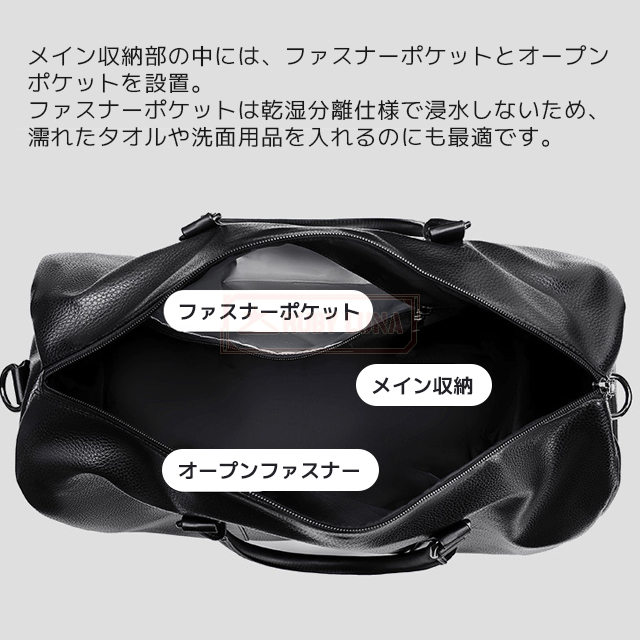| 【収納機能】 | ◆メイン収納部の中には、ファスナーポケットとオープンポケットを設置。 ◆ファスナーポケットは乾湿分離仕様で浸水しない為、濡れたタオルや洗面用品を入れるのにも最適です。 ◆またバッグの側面にはシューズ収納があり、靴の持ち運びや荷物の種類を分けたい時にも活躍します。 |