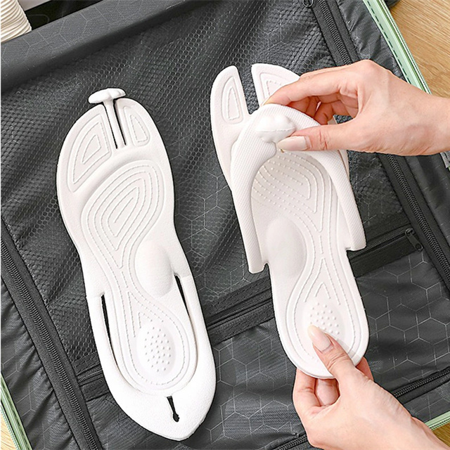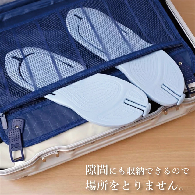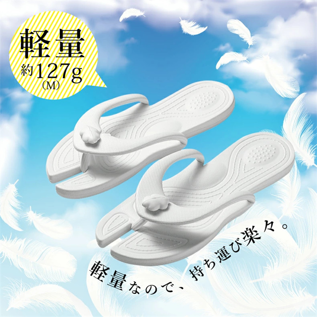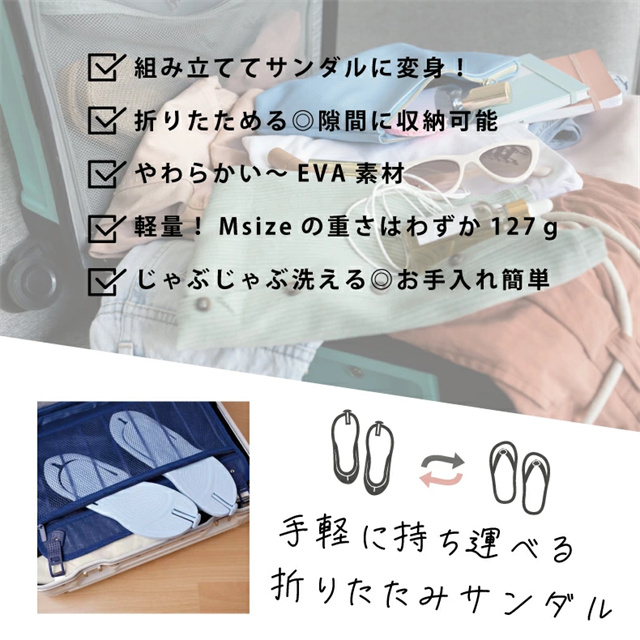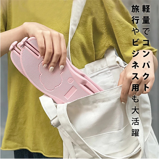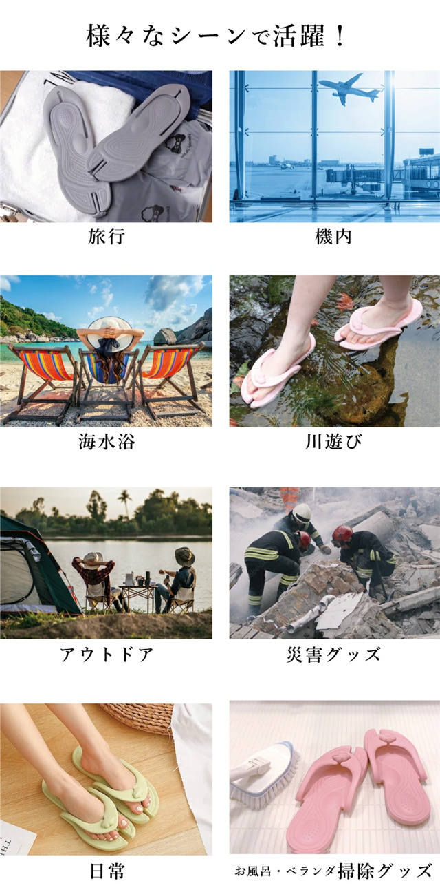 SNSで大バズり!進化した「折りたためる」トラベルサンダル ・隙間にも入れる、手軽に持ち運べる折りたたみサンダル ・片方わずか約64g(Mサイズ)。軽量なので持ち運びも便利。 ・靴底には凹凸加工に配慮しており、歩行時に安定感をもたらします。 ・旅行、出張、海外浴、帰省、日常など幅広いシーンで大活躍してくれます |