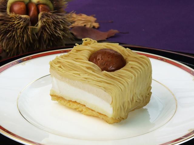 スポンジケーキの上にカスタードクリームと生クリーム、マロンクリームを重ねて、その上からマロンペーストを1.5mmの細さで絞って栗の甘露煮をトッピングした角型でおしゃれなモンブランケーキ。3種のクリームと繊細なマロンペーストが奏でるおいしさのハーモニーをお楽しみください。