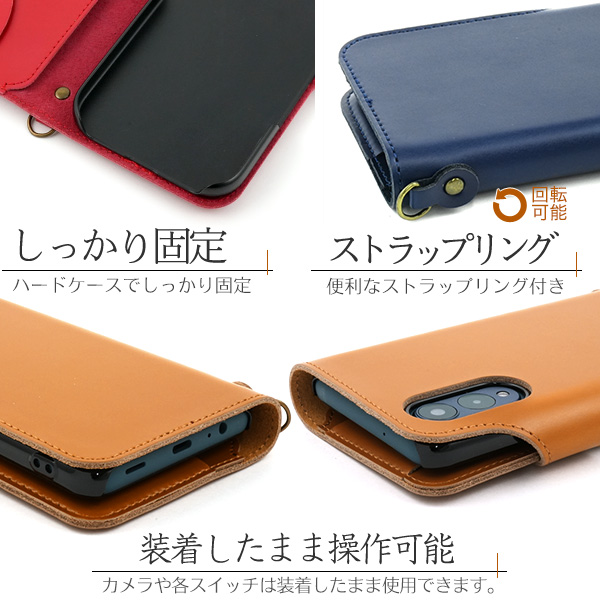 | 上質な牛革を全面に使用した、牛革手帳型ケース。 美しい質感と滑らかな触り心地の牛革を使用しています。 一つ一つ丁寧に制作しています。 実用新案登録済のカード落下防止フラップ付き! 逆さにしてもカード落下の心配がありません。 大切なカード収納時やネックストラップ使用時などに最適です。 内部ケースはハードケースなのでしっかりとスマートフォンを固定できます。 横開きタイプなので、手帳のように使うことができます。 また、内側にはカードポケット2つとフロント/サイドポケットが付いています。 しっかりと固定できるマグネット式スナップボタンを採用しています。 便利なストラップリング付きで、ストラップなどを装着可能です。 | ||||||||||||||